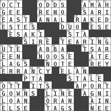 ACROSS 1. Sep. follower 4. Likelihood 8. Housemaid 12. Unit of force equal to gravity 13. Western Nevada city 14. Indian skirt 15. Compass direction 17. Of or related to the anus 18. Moved through 19. _____ Park, CO 21. Superhero pair 23. Compass dir. 24. 1973 Nobel Price Winner (Physics) Leo 26. R.R. building 28. Title for a man of rank and authority 30. Separating forcefully 34. Shoshoni 37. Swedish rock group 39. Russian ruler of old 40. Car or cant ending 41. Trap for birds or small mammals 43. Had dinner 44. Fails to keep up a pace 46. Musical sound 47. Marina Del _, California 48. The state or an instance of erring 51. Enthusiasm 54. Parent Teacher Association (abbr.) 55. Having lost freshness 58. Baseball player Mel 61. ___ a Wonderful Life 63. To the left, to Queeg 65. Brides' dresses 67. Actor's bit 71. Hindu god of fire 72. Grant temporary use of 73. Northwest Algerian city 74. The 18th letter of the Arabic alphabet 75. Otherwise 76. Labels 77. Born DOWN 1. Double curve, resembling the letter S 2. Stop 3. Trials 4. Mouth or opening 5. Lair 6. Heredity factor (abbr.) 7. Disposed of to a purchaser 8. White ___ sheet 9. Cause to be 10. Ancient Greek god of war 11. Flintstone garb 16. Beverages made from leaves 18. Roll call or roster of names 20. What Jean-Claude Killy likes to do 22. Purpose 25. SW Asia republic 27. Nonscientific branch of learning 29. Black 30. Clothes sense 31. Austrian river, tributary to the Danube 32. Nathan's nickname 33. Jennifer or Joel 34. Ubangi River tributary 35. Rend 36. Engineer (abbr.) 38. Oct. 31 cry 42. Snakelike fish 45. Plant excrement 49. Nuclear Threat Initiatives 50. Feline 52. _ moment's notice (2 wds.) 53. California wine valley 56. Utah city north of Ogden 57. Bert's buddy 58. Stare 59. Instrument 60. It was, poetically 62. Notch 64. Prong on a fork 66. Compass dir. 68. Retirement account (abbr.) 69. Tired old horse 70. Followers of ems