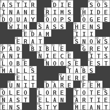 ACROSS 1. Moving about 6. Pass on 9. Distress signal 12. Silly 13. Basketball hoops 14. Flintstone garb 15. A city in N France, SE of Calais 16. I made a mistake 17. Double curve, resembling the letter S 18. Victory 19. Backtalk 20. Coop moms 21. Dutch treat 23. One more than two 24. Part of Q.E.F. 25. Overwhelms 28. Writing tablet 30. Instruction Manual for Humans 34. Jennifer or Joel 35. Cuckoo 36. Sibling's daughter 38. It is 39. Ear part 41. Trap for birds or small mammals 43. Eastern Standard Time (abbr.) 44. Promenades 46. Bar bills 48. Biblical high priest 49. We are 50. A single undivided whole 51. Have the gumption 53. Opposite of masc. 56. Butter sub 57. Old wives' tales, e.g. 58. Lugs 60. Political cartoonist Thomas 61. Flair 62. Nick name for Arthur 63. Followers of ems 64. Filthy place 65. Intended DOWN 1. Help 2. Frozen precipitation 3. "Change" in Tahitian 4. Sillier 5. Marina Del _, California 6. "Vaya con ____" 7. Naughty children 8. Curvy letter 9. Seigniories (variant) 10. Lyric poems 11. Perceive with the eye 13. Wander aimlessly 14. Cultivating 19. Smooth fabric 20. Part of HMS, perhaps 22. Pat or tap gently 24. The property of being fit to eat 26. Moistens 27. System (abbr.) 28. Inside of hand 29. Small Philippine buffalo 31. Storage container 32. Lion 33. Environmental prefix 37. First name in cosmetics 40. American author Paul (1891-1958) 42. Hearing organ 45. Be seated 47. Prior to 49. Songbird 50. ____ Bator 51. Dunce 52. Like ___ of sunshine 54. Singer James 55. Count _ (2 wds.) 56. Single 57. French article 58. Scottish cap 59. Arrange properly for use