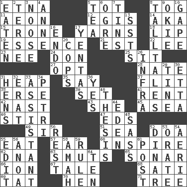 ACROSS 1. Inactive volcano in Sicily 5. Small child 8. Coat; cloak 11. Period of immesurable duration 12. Armor plate that protects the chest 14. Alias (abbr.) 15. Heavy duty weighing machine 17. Entertaining tales 18. Mouth edge 19. Substance 21. Eastern Standard Time (abbr.) 22. Area sheltered from the wind 23. Born 24. Spanish title 25. Be seated 27. Elect 28. Nathan's nickname 31. Pile 35. Declare 37. Sudden quick movement 38. Celtic language 39. Put into a specified state 41. Monthly bill 42. Political cartoonist Thomas 43. A female animal or person 45. At sea 46. Use a swizzle stick 47. Begley and Asner 49. Title for a knight 51. Ocean 52. ___ good deed 55. Erode 57. Ewer handle 60. Heighten or intensify 62. Heredity factor (abbr.) 63. Obscenities 65. Echolocation 66. Electrically charged atom 67. Story 68. Suttee (variant) 69. Make lace 70. Layer 71. Family _ (genealogy) DOWN 1. Eroded 2. Laconic 3. Trap for birds or small mammals 4. Queen of England 1702-14 5. Beverage made from leaves 6. Legendary monster 7. Canisters 8. Baron Munchausen's specialties 9. Migrant worker of the '30s 10. Stare wonderingly 13. Fast planes 16. Inside; within (prefix) 17. Gossips 20. 911 reaches them 26. Kind of red light 29. Prong on a fork 30. Singer James 31. Coop moms 32. Part of Q.E.F. 33. Helper 34. _ dish (used to culture cells) 36. Affirmative reply 40. College paper 44. Paradise 48. Backtalk 50. Repose 52. Middle Eastern gold or silver currency 53. Declaim 54. Nest on high 55. Prepare for publication 56. Small Philippine buffalo 58. Nursemaid 59. Court order 61. Mail 64. Nine, plus one