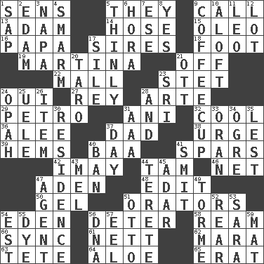 ACROSS 1. Elected reps. 5. Those things 9. Give a ring to 13. First man 14. Stockings 15. Margarine 16. Dad 17. Titles for men of rank and authority 18. One third of a yard 19. Chrissie's court nemesis 21. Below a satisfactory level 22. Promenade 23. Proofreading order 24. Fr. "Yes" 27. Marina Del _, California 28. Johnson of "Laugh-In" 29. Stone: prefix 31. Cuckoo 32. Calm and collected 36. Toward shelter 37. June honoree 38. Goad 39. Equivocates 40. Sound made by sheep 41. Practice fights 42. "If ____ say so..." 44. Scottish cap 46. Fish or hair follower 47. Arabian gulf 48. Prepare for publication 50. Set 51. Speakers 54. Paradise 56. Prevent from occurring 58. 480, 500 or 516 sheets of paper 60. Synchronize (abbr.) 61. Remaining after all deductions 62. Hindu Mythology: god of death 63. Wig 64. _ vera 65. Part of Q.E.F. DOWN 1. Plant excrement 2. Dutch treat 3. California wine valley 4. Excessive but superficial compliments 5. Without thickness 6. Israeli folk dance 7. Compass dir. 8. Affirmative reply 9. Java holder (2 wds.) 10. At or to great height 11. Lion 12. Car dealer's back yard 17. Drop; flow; fall 20. Edible starchy tuberous root 21. Baseball player Mel 23. _ Lanka 24. Brightly colored fish 25. Ubangi River tributary 26. A distinct part 28. Plus 30. Home 31. American Automobile Association (abbr.) 33. Northwest Algerian city 34. Legendary monster 35. For fear that 37. 24 hours 40. Prohibit 41. Stricken, poetically 43. Cartoonist voice _ Blanc 44. Cigar-shaped 45. The sixth month of the Jewish calendar 47. Rep 49. Singer Mel 51. Von Bismarck 52. Located in or toward the back 53. "Two Mules for Sister ____" 54. Eastern Standard Time (abbr.) 55. Color 56. Heredity factor (abbr.) 57. Snakelike fish 59. Floor covering