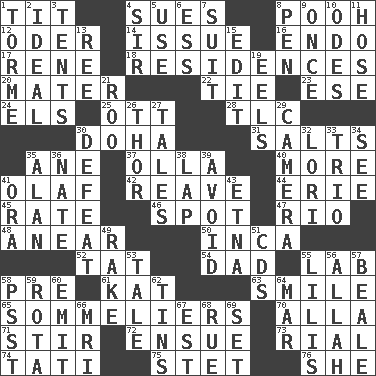 ACROSS 1. Teat (slang) 4. Takes to court 8. "Silly old bear" 12. Baltic tributary 14. Come out of 16. Inside; within (prefix) 17. French philosopher Descartes 18. Dwellings 20. Mother 22. Standoff 23. Compass dir. 24. Raised railways 25. Baseball player Mel 28. Affectionate concern, for short 30. Capital of the state of Qatar 31. Table seasonings 35. A saturated hydrocarbon 37. Rounded earthenware pot or jar 40. Greater amount 41. Norwegian king 42. Rob, plunder, or pillage 44. One of the Great Lakes 45. Pace 46. Specific locale 47. _ de Janeiro 48. Approach 50. South American Indian 52. Make lace 54. Male parent 55. Experiment locale 58. Before (prefix) 61. Krazy ___ of comics 63. Grin 65. Wine waiters 70. Silent film actress Nazimova 71. Disorderly outburst 72. Take place subsequently 73. Monetary unit of Yemen 74. Jacques of French films 75. Proofreading order 76. A female animal or person DOWN 1. Singer Mel 2. Standard of perfection 3. Portable shelters 4. Title for a knight 5. Purpose 6. Double-curved letter 7. Costume for a special activity 8. Fenced enclosure 9. Single time 10. Lyric poems 11. Flexible conduit 13. To riddle 15. Prepare for publication 19. Snakelike fish 21. Friend of Pooh 26. Son of Odin 27. Lies 29. Device for capturing images 30. Outscore 32. Australian parrot (variant) 33. Musical group of three 34. Observe 35. Actor Alda or Thicke 36. Nathan's nickname 38. Pet locale 39. Shun 41. Mouth or opening 43. Inactive volcano in Sicily 49. Libertine 51. Music discs 53. Lie 55. Ms. Damita and namesakes 56. Assad's deity 57. Memphis, Tenn. Street 58. Inconspicuous attention getter 59. Roll call or roster of names 60. Send forth 62. Airtight sealed metal containers 64. Make imperfect 66. Medical imaging device (abbr.) 67. Eastern Standard Time (abbr.) 68. Sorrow 69. Arrange properly for use