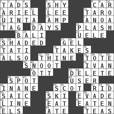 ACROSS 1. Small boys 5. Like a shrinking violet 8. Auto 11. Satellite of Uranus 13. Area sheltered from the wind 14. Pacific island yam 15. National forest in Provo, Utah 16. Electrical Unit 17. Small Philippine buffalo 18. Label 19. 24-hour periods 21. Suffix with ecto or cyto 22. Indonesian resort city 24. Ubangi River tributary 25. Cast a shadow over 27. Set 29. Jacques of French films 30. Receives possession of 32. In addition 33. One or ones belonging to thee 35. Carry 39. Snout, nose 41. _ the terrible 42. Baseball player Mel 43. Erase 45. Blemish 48. One who uses or employs something 49. Silly 50. Highlander 52. To free from 55. Ketch in the Levant 56. What Jean-Claude Killy likes to do 57. Elude 59. Actor's bit 60. Consume 61. Consumed 62. Raised railways 63. Had dinner 64. Beverages made from leaves DOWN 1. Drawn tight 2. Roberta Peters solo 3. Empty-headed or silly people 4. Put into a specified state 5. Kill 6. Cloth borders 7. Slangy assent 8. Lessep's creation 9. Came up 10. Wander aimlessly 12. Dipping utensil 14. Story 20. Help 21. Whine 23. Goodbye (Sp.) 25. R.R. building 26. Actor Linden 27. Separate the seeds from cotton 28. Supplement with great effort 30. Teat (slang) 31. Vertical member of a panel or frame 33. Small child 34. Being at a high temperature 36. Make much ado about nothing 37. Make lace 38. Compass dir. 40. Brief written record 43. Superhero pair 44. First name in cosmetics 45. Slow-paced one 46. Aches 47. Single time 49. Small island 50. Three-handed card game 51. Quote 53. The content of cognition 54. Cub Scout units 56. Ocean 58. Large container