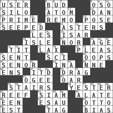 ACROSS 1. One who uses or employs something 5. Partially opened flower 8. Bear (Spanish) 11. Grain storage tower 12. Smallest unit of an element 14. Daniel's nick name 15. First class 17. San ____ (Riviera town) 18. Airs 19. Oozed 21. Michaelmas daisies 23. French article 25. Austrian river, tributary to the Danube 26. Small island 27. Not either 28. Mature 31. Teat (slang) 33. Not strict 35. Entreaties 37. Transmitted 38. _-fi 40. I made a mistake 41. Sir (Sp.) 43. _ tizzy (2 wds.) 45. Compass dir. 46. Followers of ems 47. It would 50. To trail on the ground 52. Double curve, resembling the letter S 53. Boat paddle 54. Flight of steps 56. Of or pertaining to yesterday 61. Coral collection 62. Thailand, formerly 65. Having winglike extensions 66. Car or cant ending 67. He sold his birthright 68. "Beetle Bailey" pooch 69. Eastern Standard Time (abbr.) 70. Label 71. Prejudice DOWN 1. United States Postal Service (abbr.) 2. Beget 3. Writer Wiesel 4. Play 5. Long, evenly shaped piece 6. Shoshoni 7. Realm 8. Scent 9. Backtalk 10. Single 13. With motion or animation 16. Snakelike fish 18. For each 20. Small valley 22. Canvas cover 24. Oceans 26. "Tell ____ the Marines!" 28. Age 29. Yawn 30. Double-curved letter 31. Adolescent 32. Restaurants 34. One more than ninety 36. Yearn 37. Compass dir. 39. Southeast Asian peninsula 42. Swiss mountan, "Queen of the Mountains" 44. Like ___ of sunshine 48. Laconic 49. Stop 51. Length times width 52. Clumsy lout 54. Perceives with the eye 55. Portable shelter 57. Messy guy 58. Jacques of French films 59. Singer James 60. Vintage cars 61. To riddle 63. Auto club (abbr.) 64. Java container