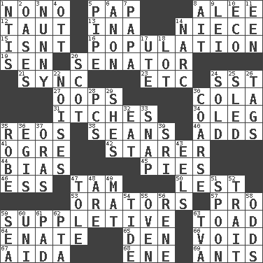ACROSS 1. Words to Nanette 5. Infant food 8. Toward shelter 12. Pulled tight 13. _ tizzy (2 wds.) 14. Sibling's daughter 15. Is not 16. Census information 19. Elected rep. 20. Elected representative 21. Synchronize (abbr.) 23. And so on (abbr.) 24. Fast jet (abbr.) 27. I made a mistake 30. Root beer relative 31. Skin irritations 34. Cassini of fashion 35. Vintage cars 38. Actors Connery and Penn 40. Sums up 41. Legendary monster 42. A viewer who gazes fixedly 44. Prejudice 45. Sliced desserts 46. Curvy letter 47. Scottish cap 50. For fear that 53. Speakers 57. Adept person 59. Supplementary 63. Frog relative 64. Related on the mother's side 65. Lair 66. Lacking any legal or binding force 67. Opera by Verdi 68. Compass dir. 69. Pismires DOWN 1. Nuclear Threat Initiatives 2. Fertile tracts in a desert 3. Pet term 4. Baseball player Mel 5. Corncob 6. Soon (poet.) 7. Dad 8. Small island 9. Luau accessory 10. Environmental prefix 11. Car or cant ending 14. Drug cop 17. Shoshoni 18. Car dealer's back yard 20. Native of Scotland 22. Annoying sounds 24. Exchanged or delivered for money 25. Downhill vehicle 26. Labels 28. Personal Computers (abbr.) 29. "______ My Girl" (Turtles hit) 30. Unrefined 32. Erode 33. Fastener 35. Loose flowing garment 36. The front part of a cuirass 37. Mouths or openings 39. Indian title of respect (Mr.) 43. Snakelike fish 47. Lacquered or enameled metalware 48. "We ___ not amused" (Victoria) 49. Floor covering 51. Soup utensil 52. Distinguishing feature 54. Event that recurs at intervals 55. Baking chamber 56. French philosopher Descartes 58. Likelihood 59. Ocean 60. University (slang) 61. Writing tablet 62. Parent Teacher Assoc. 63. Federal power corp.
