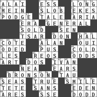 ACROSS 1. Jai ____ 5. Curvy letter 8. Yearn 12. Count _ (2 wds.) 13. Oscar Madison type 15. Supplements with great effort 16. Puddle 18. Story 19. Operatic vocal solo 20. Period 22. Commissioned military rank 24. Disposed of to a purchaser 26. Elected rep. 27. Russian ruler of old 28. Spanish title 29. Actor Linden 32. ____ d'Azur (French Riviera) 35. ____ Jay Lerner 37. Fr. "Yes" 38. Wrote a lyric poem 39. Ichor 40. Having a low temperature 41. French article 42. Vintage cars 43. Probability 44. Tate display 45. Two (Sp.) 46. "Terrible" tsar 49. Teachers' org. 50. Hearing organs 51. "Death Wish" actor 55. The 19th letter of the Greek alphabet 56. Oceans 57. Loyal 59. Grin 63. Wig 64. Without 65. Genesis locale 66. Ancient Greek god of war 67. Compass dir. 68. Texas town _ City DOWN 1. Electrical Unit 2. Lion 3. Help 4. Consumed 5. Eastern Standard Time (abbr.) 6. Volcanic refuse 7. Flatfish 8. Memorize 9. Gumbo ingredient 10. Famous astronaut Armstrong 11. Girls' org. (abbr.) 14. Gillaume's butler role 17. Greek god of love 21. Chicken ___ king 23. Car or cant ending 25. Window treatments 28. Hyrax 29. Parka part 30. Old (Scot.) 31. Flaplike coverings 32. Root beer relative 33. Baltic tributary 34. Trial 36. Nilotic language 40. Ingested 42. Exposes to great heat 45. Lair 47. Large container 48. Ancient river in northeast Turkey 49. Olfactory organs 51. Fermented drink made from hops 52. Pace 53. Mouths or openings 54. Religious women 56. R.R. building 58. Compass dir. 60. Wedding promise 61. Directed 62. Conclusion