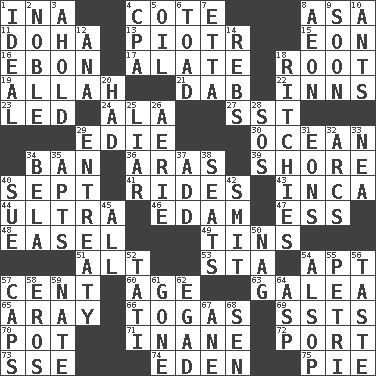 ACROSS 1. _ tizzy (2 wds.) 4. ____ d'Azur (French Riviera) 8. White ___ sheet 11. Capital of the state of Qatar 13. Peter (Polish) 15. A really long time 16. Inky black, to poets 17. Having winglike extensions 18. Carrot, for example 19. Assad's deity 21. Apply (a substance) by light strokes 22. Lodging establishments 23. Directed 24. Wing 27. Fast jet (abbr.) 29. Singer Brickell 30. Sea 34. Forbid 36. Caspian sea tributary 39. Dinah or Pauly 40. Back-to-school mo. 41. Amusement-park features 43. South American Indian 44. Extreme 46. Dutch treat 47. Curvy letter 48. Artist's stand 49. Metal containers 51. The first octave above the treble staff 53. R.R. building 54. Fitting 57. Penny 60. Grow older 63. An organ shaped like a helmet 65. Like ___ of sunshine 66. Ancient Roman robes 69. Fast planes 70. Cooking vessel 71. Silly 72. Left side of a ship or aircraft 73. Compass dir. 74. Locale of original sin 75. Sliced dessert DOWN 1. Standard of perfection 2. Having high moral qualities 3. Hold, grip (Informal) 4. Accounting whiz (abbr.) 5. Lubricate 6. Frog relative 7. Singer James 8. Period of immesurable duration 9. Within a short period 10. Pismires 12. Santa ___, CA 14. Confederate soldiers (slang) 18. Actors Guy, Robert Welles, and Clint 20. Possessed 25. One who doesn't tell the truth 26. Nest on high 28. Distress signal 29. Plea 31. Immeasurably long periods of time 32. Curves 33. Teachers' org. 34. Actor Lugosi 35. Tenement units (abbr.) 37. Say or write further 38. Theater features 40. Take to court 42. Stricken, poetically 45. 100% 50. Tired old horse 52. Jacques of French films 54. Columnist Joseph or Stewart 55. _ dish (used to culture cells) 56. Clothes sense 57. Balmoral and tarboosh 58. Greek god of love 59. Nathan's nickname 61. Went 62. Mild oath 64. Cleo's killer 67. One (Scot) 68. Elected rep.