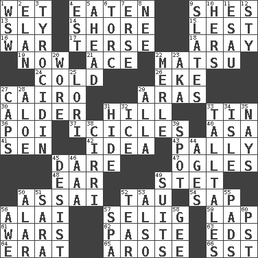 ACROSS 1. Dripping 4. Eroded 9. "______ My Girl" (Turtles hit) 13. Insidious 14. Dinah or Pauly 15. For fear that 16. Armed conflict 17. Laconic 18. Like ___ of sunshine 19. At this time 21. Adept person 22. Taiwanese island in East China Sea 24. Having a low temperature 26. Supplement with great effort 27. Capital of Egypt 29. Ancient river in northeast Turkey 30. Tree or shrub in the Birch family 31. Land elevation 33. Shallow baking pan 36. Luau course 37. Winter's stalactites 40. White ___ sheet 41. Elected rep. 42. The content of cognition 43. Chummy 45. Have the gumption 47. Stares at amorously 48. Hearing organ 49. Proofreading order 50. Slender Brazilian palm 52. The 19th letter of the Greek alphabet 54. Plant excrement 56. Jai _ 57. Major League Baseball Commissioner Bud 59. Pet locale 61. Armed conflicts 62. Thick mixture 63. Begley and Asner 64. Part of Q.E.F. 65. Came up 66. Fast jet (abbr.) DOWN 1. Compass dir. 2. Enthusiasm 3. Polypeptide antibiotic 4. Eastern Standard Time (abbr.) 5. Having the leading position 6. Torque (variant) 7. Celtic language 8. Born 9. Chalkboards 10. Possessive pronoun 11. He sold his birthright 12. Filthy place 20. Had on 22. Haggard of country music 23. Alias (abbr.) 25. Australian parrot (variant) 27. Balmoral and tarboosh 28. _ vera 29. Silent film actress Nazimova 31. Flintstone garb 32. Frozen water 33. Baron Munchausen's specialties 34. Capri or Wight 35. Negative votes 38. High-altitude cloud 39. Specific locale 44. Matures 45. Cease 46. American Automobile Association (abbr.) 49. Costumes for special activities 50. Having or resembling wings 51. "Two Mules for Sister ____" 52. Rend 53. In addition 55. Groovy apts. 56. Deep reverence 57. Health resort 58. Unit of force equal to gravity 60. Pacific Standard Time (abbr.)