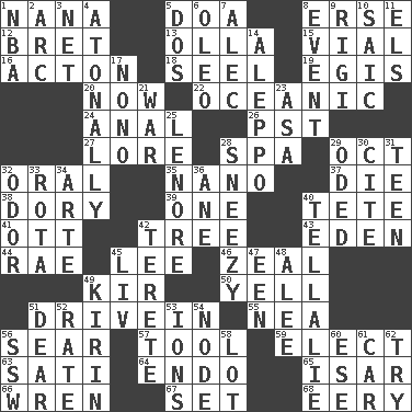 ACROSS 1. Grandmother 5. ___ good deed 8. Celtic language 12. Cy Young winner Saberhagen 13. Spanish pot 15. Small bottle 16. NE Massachussets city 18. Stitch closed the eyes of (a falcon) 19. The front part of a cuirass 20. Immediately 22. Pertaining to the sea 24. Of or related to the anus 26. Pacific Standard Time (abbr.) 27. Old wives' tales, e.g. 28. Health resort 29. Sep. follower 32. Relating to the mouth 35. Billionth: prefix 37. Expire 38. Dinghy 39. Single 40. Wig 41. Baseball player Mel 42. Family _ (genealogy) 43. Genesis locale 44. Actress Charlotte 45. Area sheltered from the wind 46. Ardor 49. Apertif with cassis 50. Shout 51. Popular '50s hangout 55. Teachers' org. 56. Burn superficially 57. Instrument 59. Choose 63. Suttee (variant) 64. Inside; within (prefix) 65. Austrian river, tributary to the Danube 66. Songbird 67. Put into a specified state 68. Suggestive of the supernatural DOWN 1. Basketball assoc. 2. Curve 3. Fish or hair follower 4. Without tonality 5. Two (Sp.) 6. Butter sub 7. Actor Baldwin 8. Incident 9. Swiss mountan, "Queen of the Mountains" 10. Ketch in the Levant 11. Raised railways 14. City in Syria 17. Words to Nanette 21. Armed conflict 23. White ___ sheet 25. Poe poem 28. Dwarf with a sinus problem 29. Wrote a lyric poem 30. Quote 31. Adolescent 32. Scent 33. Roll call or roster of names 34. Johnson of "Laugh-In" 36. A saturated hydrocarbon 40. Copy Pinocchio 42. Cylindrical with tapered ends 45. 54 in ancient Rome 47. Car or cant ending 48. Toward shelter 49. Japanese brewing company 51. Letter starter 52. Pace 53. Charged particles 54. Connecting point 56. Compass dir. 58. Car dealer's back yard 60. Compass dir. 61. Auto 62. Attempt