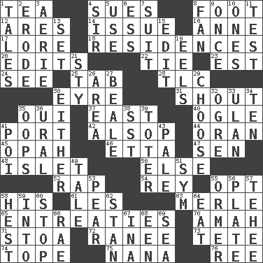 ACROSS 1. Afternoon social gathering 4. Takes to court 8. One third of a yard 12. Ancient Greek god of war 14. Come out of 16. Queen of England 1702-14 17. Old wives' tales, e.g. 18. Dwellings 20. Prepares for publication 22. Make a knot 23. Eastern Standard Time (abbr.) 24. Perceive with the eye 25. Bar bill 28. Affectionate concern, for short 30. Jane of fiction 31. Yell 35. Fr. "Yes" 37. 90 degrees 40. Stare 41. Sweet dark-red dessert wine 42. Columnist Joseph or Stewart 44. Northwest Algerian city 45. Brightly colored fish 46. Singer James 47. Elected rep. 48. Small island 50. Otherwise 52. Hit sharply and swiftly 54. Marina Del _, California 55. Elect 58. Part of HMS, perhaps 61. French article 63. Haggard of country music 65. Pleas 70. Wet nurse 71. Portico 72. Indian princess (variant) 73. False hair 74. Drink excessively 75. Nanny 76. To riddle DOWN 1. Stories 2. Wear away 3. Nest on high 4. Title for a knight 5. Purpose 6. Double-curved letter 7. Costume for a special activity 8. Air blower 9. At one time in the past 10. Singles 11. Trial 13. Put into a specified state 15. Prepare for publication 19. Snakelike fish 21. Filthy place 26. Length times width 27. Memphis, Tenn. Street 29. Elect 30. One or the other 32. Legendary monster 33. Uhlan (variant) 34. "___ Little Indians" 35. I made a mistake 36. Mountain range 38. Fast jet (abbr.) 39. Carrier 41. Luau course 43. Light colored 49. Falsehood 51. Symbol (abbr.) 53. Lightbulb-shaped fruit 55. Channel Islands abalone 56. Food holder 57. Giggle 58. Command 59. To the inside or interior of 60. Discontinue 62. Comedian Laurel of Laurel & Hardy 64. Consume 66. Actress Charlotte 67. _ tizzy (2 wds.) 68. Car or cant ending 69. Ocean