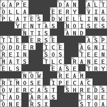 ACROSS 1. Open wide 5. Daniel's nick name 8. Keyboard modifier key 11. Spanish pot 12. Suggestive of the supernatural 13. By way of 14. Food holders 17. Residence 19. Gossips 21. Annoying sounds 22. Nuclear Threat Initiatives 23. Plus 24. Neckwear 27. Celtic language 29. Cleo's killer 32. More peculiar 34. Frozen water 36. Hindu god of fire 37. It's straight from the horse's mouth 38. Mayday 39. Adolescent 40. Floor coverings 41. Affectionate concern, for short 42. Indian princess (variant) 43. Raised railways 44. Comfort 46. Attempt to accomplish something 47. Immediately 50. 480, 500 or 516 sheets of paper 52. Full of chinks, cracks, or crevices 55. Medicinal drug used to evoke vomiting 57. Cloudy 59. Fragments 62. Small boy 63. Caspian sea tributary 64. Loyal 65. Single 66. Acura sports coupe 67. Portico DOWN 1. Grand Old Party 2. Everything 3. Shaw product 4. Ingested 5. Morning condensation 6. Sports stadium 7. Thermoplastic polyamide 8. Opinion 9. Actor's bit 10. Labels 12. Begley and Asner 15. Keyboard key 16. Move through with a circular motion 18. Flaplike covering 20. Help 24. Singer Mel 25. Standard of perfection 26. Proofreads 28. Learning spot: Fr. 29. Rep 30. Contemptuous expression 31. Abounding in pines 33. Followers of ems 35. Fortification 36. _ moment's notice (2 wds.) 42. Arrive at 45. Perceives with the eye 47. Or not 48. Motion picture award 49. Erodes 51. Shops 52. Printing process, for short 53. "Terrible" tsar 54. Ancient Persian 55. ___ a Wonderful Life 56. An absolute certainty 58. Saxophone 60. Superhero pair 61. Ocean