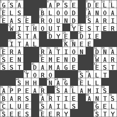 ACROSS 1. Girls' org. (abbr.) 4. Domed church section 8. Small valley 12. Raised railways 13. Vital fluid 14. Small Philippine buffalo 15. Relaxation 17. One shot 18. Indian skirt 19. Sans 21. Next before 23. R.R. building 24. Color 26. Expire 27. Slanted text style (abbr.) 28. Leg joint 30. Epoch 31. Food allowance for one day 34. Heredity factor (abbr.) 37. Elected rep. 38. Make improvements or corrections to 39. Armed conflict 40. Fast jet (abbr.) 41. Break 42. Eastern Standard Time (abbr.) 43. "Corrida" creature 44. Table seasoning 46. Quiet! 47. Tired old horse 50. Pipe bend 51. Seem 54. Deli grouping 57. Taverns 58. Nick name for Arthur 60. Pismires 62. A slight indication 63. Travel by water 64. Set 65. Observes 66. Suggestive of the supernatural 67. Filthy place DOWN 1. Unit of force equal to gravity 2. Cole _ (cabbage dish) 3. Aide 4. Verbally 5. Marked by pouting 6. Male offspring 7. Whirlpool 8. Small ungulate mammals of Africa 9. Maternal 10. Old wives' tales, e.g. 11. Den 13. Sis' sibling 16. Singer James 20. Actor Linden 22. Locale of original sin 25. Supplementing with great effort 27. Angers 29. Connecting point 30. Curvy letter 31. Stern 32. ID or VA city 33. Beverage made from leaves 34. Homes 35. Political cartoonist Thomas 36. Tate display 41. Capital of the state of Qatar 43. College papers 44. Ocean 45. _ mater 46. Disorder 48. Moving about 49. Lightheartedly 51. Lettered men learn these first 52. Light colored 53. Raze (variant) 55. French article 56. Proofreading order 59. Actress Charlotte 61. Wily