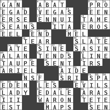 ACROSS 1. Separate the seeds from cotton 4. Blind as ____ 8. Adept person 11. Mild oath 13. Viva Las _ 15. Car or cant ending 16. Celtic language 17. World-weariness 18. Not wild 19. Seines 21. Call ___ day 22. Greek god of love 23. Snakelike fish 24. Conclusion 27. Cartoonist voice _ Blanc 29. Rend 30. Schedule 34. Had dinner 36. Trig term 39. Indian antelope 40. ____ Jay Lerner 41. Looks after 43. Actor's bit 44. Grayish beige 46. Posted 47. Big collection agency 48. Satellite of Uranus 49. Assistant 51. Overdraft (abbr.) 53. _ Lanka 54. Health resort 57. Locale of original sin 60. French article 63. Vices 65. Kenny Rogers chart-topper in '80 66. Peak District village in England 69. Caspian sea tributary 70. One more than two 71. Make _____ (do battle with) 72. Wig 73. Eastern Standard Time (abbr.) 74. Atlas contents 75. Elected rep. DOWN 1. Honkers 2. Match 3. Rhinal 4. "___ Maria" 5. Benjamin's nick name 6. Hindu god of fire 7. Strained 8. Lightbulb-shaped fruit 9. San ____ (Riviera town) 10. Singles 12. Lair 14. Thailand, formerly 18. Copy Pinocchio 20. Perceive with the eye 25. Political cartoonist Thomas 26. Frees from moisture 28. Double-curved letter 29. 3-inch nail 31. SW Saudi Arabia district 32. Metal containers 33. Compass dir. 34. Having or resembling wings 35. "Change" in Tahitian 37. Compass dir. 38. Ferber et al. 40. "One Day ___ Time" 42. Commotion 45. Raised railways 50. Pass on 52. Soared 54. Founders of families 55. Food holder 56. NE Netherlands city 57. Writer Wiesel 58. Raised platform 59. Prepare for publication 61. Dutch treat 62. "Two Mules for Sister ____" 64. Large container 67. Trim (branches) 68. Followers of ems