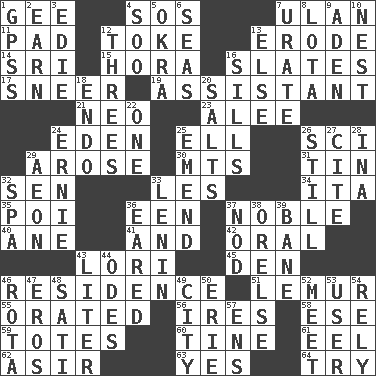 ACROSS 1. Turn to the right 4. Distress signal 7. ____ Bator 11. Writing tablet 12. Casino tip 13. Wear away 14. _ Lanka 15. Israeli folk dance 16. Chalkboards 17. Scornful expression 19. Aide 21. Modern: prefix 23. Toward shelter 24. Locale of original sin 25. Pipe bend 26. _-fi 29. Came up 30. Mountains (abbr.) 31. Shallow baking pan 32. Elected rep. 33. French article 34. Call ___ day 35. Luau course 36. Car or cant ending 37. Impressive in appearance 40. A saturated hydrocarbon 41. Plus 42. Relating to the mouth 43. Australian parrot (variant) 45. Lair 46. Home 51. Arboreal primate 55. Declaimed 56. Angers 58. Compass dir. 59. Hauls 60. Prong on a fork 61. Snakelike fish 62. SW Saudi Arabia district 63. It is so 64. Attempt to accomplish something DOWN 1. Global Positioning Systems (abbr.) 2. Merit 3. Singer Brickell 4. "Barney Miller" actor Jack 5. Gumbo ingredient 6. Oceans 7. A salt of uric acid 8. Globular water bottle used in Asia 9. Arabian gulf 10. Egg locale 12. Triads 13. Otherwise 16. Beverly of Met fame 18. Inside; within (prefix) 20. Table seasonings 22. Single 24. Bert's buddy 25. Make improvements or corrections to 26. Free of sound 27. Quote 28. _ tizzy (2 wds.) 29. Age 32. Health resort 33. Soviet premier 1918-24 36. Having ears or earlike features 37. Dreamland 38. Threatening words 39. Object of repulsion 43. 61 cubic inches 44. Lyric poems 46. Round or rotation of duties 47. Greek god of love 48. Suttee (variant) 49. Municipality 50. 4th largest of the Great Lakes 52. Confront 53. One who makes use of a thing 54. Depend 57. Followers of ems