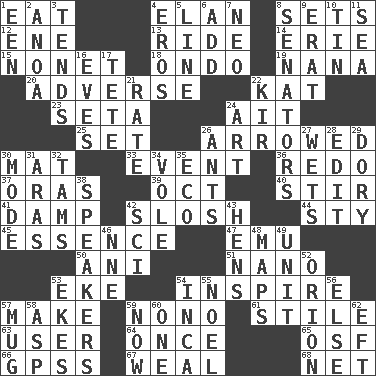 ACROSS 1. Ingest 4. Liveliness 8. Puts into a specified state 12. Compass dir. 13. Travel on an animal 14. 4th largest of the Great Lakes 15. Music written for nine 18. Southwest Nigerian state 19. Grandmother 20. Contrary to your interests or welfare 22. Krazy ___ of comics 23. Bristle 24. Small island 25. Arrange properly for use 26. Moved like an arrow 30. Floor protector 33. Incident 36. Make new 37. Mouths or openings 39. Sep. follower 40. Commotion 41. Moist 42. Agitate, as a liquid 44. Filthy place 45. Core 47. Australian flightless bird 50. Cuckoo 51. Billionth: prefix 53. Make supply last 54. Heighten or intensify 57. Create 59. Words to Nanette 61. Vertical member of a panel or frame 63. One who makes use of a thing 64. Single time 65. Order of Saint Francis (abbr.) 66. Global Positioning Systems (abbr.) 67. Welt 68. Fish or hair follower DOWN 1. Car or cant ending 2. Small Philippine buffalo 3. Is inclined (to) 4. Greek god of love 5. Actor's bit 6. Find the sum of 7. Modern: prefix 8. Elected representatives 9. Part of Q.E.F. 10. Metal container 11. Ocean 16. Nights before holidays 17. False hair 21. Pace 22. Apertif with cassis 24. Tate display 26. Pismires 27. Moistens 28. Prepare for publication 29. Small, narrow, flatbottom fishing boat 30. Method 31. Caspian sea tributary 32. Scottish caps 34. Grand slam 35. Environmental prefix 38. Orators 42. _-fi 43. Coop moms 46. Compass dir. 48. Atlas contents 49. A single undivided whole 52. Constellation of myth 53. Makes supply last 54. South American Indian 55. Christmas carol 56. Otherwise 57. Large cup 58. Cleo's killer 59. Immediately 60. Single 62. Bank Draft (abbr.)