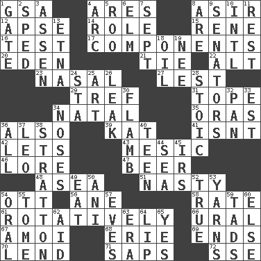 ACROSS 1. Girls' org. (abbr.) 4. Ancient Greek god of war 8. SW Saudi Arabia district 12. Domed church section 14. Hero or heavy, e.g. 15. French philosopher Descartes 16. Trial 17. Parts 20. Locale of original sin 21. Make a knot 22. The first octave above the treble staff 23. Relating to the nose 27. For fear that 29. Unclean, religiously 31. Drink excessively 34. Relating to or accompanying birth 35. Mouths or openings 36. In addition 39. Krazy ___ of comics 41. Is not 42. Allows 43. Mesonic 46. Old wives' tales, e.g. 47. Fermented drink made from hops 48. Toward the sea 51. Thoroughly unpleasant 54. Baseball player Mel 56. A saturated hydrocarbon 58. Assign a rank or rating to 61. Happening in regular succession 66. Mountain range 67. Mine, in Marseilles 68. One of the Great Lakes 69. Extremities 70. Grant temporary use of 71. Plant excrements 72. Compass dir. DOWN 1. Yard entry 2. Moved rapidly 3. NE Netherlands city 4. Curve 5. Friend of Pooh 6. Shade tree 7. Back-to-school mo. 8. "We ___ not amused" (Victoria) 9. Elected representatives 10. International (abbr.) 11. Remainder 13. Inactive volcano in Sicily 18. Lubricate 19. Born 24. R.R. building 25. Tate display 26. Path through which fluid escapes 28. Unemotional 30. Flambe (short form) 32. Baking dish 33. Eastern Standard Time (abbr.) 34. Olfactory organs 36. Everything 37. Lion 38. Ski resort town in Vermont 40. Adolescent 44. Ocean 45. Big collection agency 49. Ingest 50. Black tropical American cuckoo 52. Loyal 53. Tall tales 54. Taken by mouth 55. Heavy book 57. Nights before holidays 59. Bits 60. Otherwise 62. Assist 63. Period 64. Mouth edge 65. Consenting reply