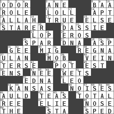 ACROSS 1. Scent 5. One (Scot) 8. Sound made by sheep 11. Hero or heavy, e.g. 12. Hang loosely or laxly 14. Fitting 15. Assad's deity 17. Loyal 18. Otherwise 19. A viewer who gazes fixedly 21. Small ungulate mammals of Africa 23. Chop off 25. Greek god of love 26. Coast Guard woman 27. Heredity factor (abbr.) 28. Cleo's killer 31. Unit of force equal to gravity 33. Russian fighter aircraft 35. Canadian anthropologist Darnell 37. Uhlan (variant) 38. Crowd into 40. Distinctive style or manner 41. Laconic 43. Cooking vessel 45. Eastern Standard Time (abbr.) 46. Followers of ems 47. Born 50. Moistens 52. Pulitzer Prize-winning author Ferber 53. Lion 54. Sunflower state 56. Annoying sounds 61. Old (Scot.) 62. Beverages made from leaves 65. Add up to 66. To separate or throw off 67. Writer Wiesel 68. Characteristic smell of wine 69. Definite Article 70. R.R. building 71. Hurried DOWN 1. Mouths or openings 2. Dunce 3. Water jar 4. Located in or toward the back 5. Keyboard modifier key 6. Not either 7. Dodged 8. Indonesian resort city 9. Domed church section 10. Had dinner 13. Acquire or gain knowledge or skills 16. Assist 18. Double-curved letter 20. Wander 22. Fly high 24. Demure 26. Elected reps. 28. Matures 29. In a ____ (agitated or irritated) 30. Baking dish 31. Small, secluded valley 32. Hearing organs 34. Republican Party 36. Nights before holidays 37. Shoshoni 39. Soup holder 42. Extremities 44. Adolescent 48. Related on the mother's side 49. Artist's stands 51. A blast of a horn 52. Conclude 54. Malaysian steamed pastry 55. Toward shelter 57. Charged particles 58. Halt 59. Comfort 60. Downhill vehicle 61. Nonscientific branch of learning 63. Small island 64. Ocean