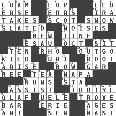 ACROSS 1. Rich soil 5. Chop off 8. Directed 11. Celtic language 12. Blunders 14. Lyricist Gershwin 15. Receives possession of 17. Highlander 18. Overwhelm 19. Scheduled 21. Annoying sounds 23. ___ Haven, CT 25. Prong on a fork 26. Son of Isaac 27. Sep. follower 28. Be seated 31. Nine, plus one 33. 17th letter of the Greek alphabet 35. Money paid out 37. Rampant 38. RI univ. 40. Carrot, for example 41. Get up 43. Arrow shooter 45. Slender fish 46. Portuguese money of account (variant) 47. Afternoon social gathering 50. California wine valley 52. Religious women 53. R.R. building 54. Help 56. Trinitrotoluene 61. Norwegian king 62. Ubangi River tributary 65. Collection of objects 66. Drinking establishment 67. 4th largest of the Great Lakes 68. Grows older 69. Black tropical American cuckoo 70. Elected rep. 71. Political cartoonist Thomas DOWN 1. Allows 2. Of the mouth 3. "____ silly question..." 4. Confront 5. French article 6. The grampus (Milton) 7. Right away 8. Actor's bit 9. Greek god of love 10. Fool 13. Unemotional 16. Elected reps. 18. Compass dir. 20. Letter starter 22. To the inside or interior of 24. Chinese city south-southwest of Nanjing 26. Extremities 28. Portico 29. Composer Stravinsky 30. Small child 31. Hoop that covers a wheel 32. Writer Wiesel 34. Globe 36. Capital and largest city of Mongolia 37. Armed conflict 39. Charged particles 42. Needle case 44. Electrical Unit 48. Follow as a consequence or result 49. Michaelmas daisies 51. Piece 52. Science/research agcy. 54. ____ Jay Lerner 55. Indian skirt 57. Northwest Algerian city 58. Ancient Roman robe 59. Jacques Cousteau's middle name 60. For fear that 61. Chief or king in Benin or Nigeria 63. Whopper 64. Car or cant ending