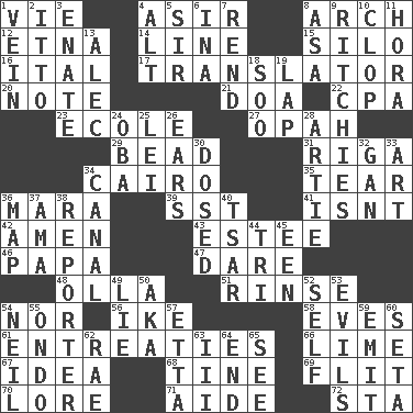 ACROSS 1. Compete 4. SW Saudi Arabia district 8. Bowlike part 12. Inactive volcano in Sicily 14. Actor's bit 15. Grain storage tower 16. Slanted text style (abbr.) 17. Interpreter 20. Musical sound 21. ___ good deed 22. Tax preparer (abbr.) 23. Learning spot: Fr. 27. Brightly colored fish 29. Necklace unit 31. Capital of Latvia 34. Capital of Egypt 35. Rend 36. Hindu Mythology: god of death 39. Fast jet (abbr.) 41. Is not 42. So be it 43. First name in cosmetics 46. Dad 47. Have the gumption 48. Spanish pot 51. Remove soap 54. Or not 56. Eisenhower's nickname 58. Nights before holidays 61. Pleas 66. Welles in "The Third Man" 67. The content of cognition 68. Prong on a fork 69. Sudden quick movement 70. Old wives' tales, e.g. 71. Helper 72. R.R. building DOWN 1. Distinctive style or manner 2. "Tell ____ the Marines!" 3. Maternal 4. Keyboard modifier key 5. Title for a knight 6. _ tizzy (2 wds.) 7. Tear apart 8. White ___ sheet 9. Actors Guy, Robert Welles, and Clint 10. Hoof sound 11. Israeli folk dance 13. Actor Baldwin 18. "Barney Miller" actor Jack 19. Infant locale 24. Chief or king in Benin or Nigeria 25. Luau accessory 26. Hearing organs 28. Nick name for Arthur 30. Administered medicine 32. Separate the seeds from cotton 33. Tate display 34. Lessep's creation 36. Atlas unit 37. Wet nurse (var.) 38. News announcer 40. Russian ruler of old 44. Three (prefix) 45. Car or cant ending 49. Falsehood 50. Alias (abbr.) 52. Automatically 53. Vices 54. Famous astronaut Armstrong 55. Southwest Nigerian state 57. Singer James 59. Give off 60. Bristle 62. Actress Charlotte 63. One more than two 64. Conclude 65. Observe