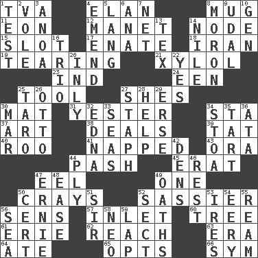 ACROSS 1. Federal power corp. 4. Enthusiasm 8. Java container 11. Period of immesurable duration 12. French painter Edouard 14. Connecting point 15. Narrow opening 17. Maternal 18. SW Asia republic 19. Separating forcefully 21. Xylene (variant) 23. Working for oneself (abbr.) 24. Car or cant ending 25. Utensil 27. "______ My Girl" (Turtles hit) 30. Floor protector 31. Last 34. R.R. building 37. Tate display 38. Allots cards 39. Make lace 40. Friend of Pooh 41. Slept 43. Mouth or opening 44. Romantic infatuation 45. Part of Q.E.F. 47. Snakelike fish 49. Single 50. Trading vessels 52. More disrespectful 56. Elected reps. 57. An arm off of a larger body of water 60. Relationship diagram 61. 4th largest of the Great Lakes 62. Arrive at 63. Period 64. Had dinner 65. Elects 66. Symbol (abbr.) DOWN 1. Trial 2. Short-tailed, large-bodied rat 3. Small Philippine buffalo 4. Make improvements or corrections to 5. Long (Scottish) 6. Santa ___, CA 7. Fish or hair follower 8. Person of subnormal intelligence 9. Freehold land 10. Commissioned mil. rank 13. John Ritter's dad 14. The longest river in the world 16. Musical group of three 20. Inwardly 22. Consenting reply 25. Edible starchy tuberous root 26. "Beetle Bailey" pooch 27. Staphylococcus 28. Assist 29. Celtic language 30. Impair 32. Pulitzer Prize-winning author Ferber 33. Oceans 34. Portico 35. Small pie 36. _ moment's notice (2 wds.) 42. Cub Scout units 44. Travel a route regularly 46. Relief 47. Bert's buddy 48. Comfort 49. Curses 50. Sure thing 51. Title for a knight 52. Religious group 53. Angers 54. Suggestive of the supernatural 55. 480, 500 or 516 sheets of paper 56. Ocean 58. Modern: prefix 59. Pet locale