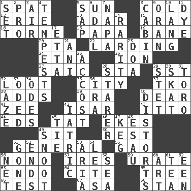 ACROSS 1. Petty quarrel 5. Player for Phoenix 8. Having a low temperature 12. One of the Great Lakes 13. The sixth month of the Jewish calendar 15. Like ___ of sunshine 16. Singer Mel 18. Dad 19. Object of repulsion 20. Parent Teacher Association (abbr.) 22. Preparing or cooking with lard 24. Inactive volcano in Sicily 26. Electrically charged atom 27. Ketch in the Levant 28. R.R. building 29. Fast jet (abbr.) 32. Spoils 35. Municipality 37. Ring climax 38. Does sums 39. Mouth or opening 40. Letter starter 41. Last letter of the English alphabet 42. Austrian river, tributary to the Danube 43. "Tell ____ the Marines!" 44. Begley and Asner 45. Make lace 46. Supplements with great effort 49. Be seated 50. Remainder 51. Commissioned military rank 55. E Mali city 56. Words to Nanette 57. Angers 59. A salt of uric acid 63. Inside; within (prefix) 64. Quote 65. Woody plant 66. Trial 67. White ___ sheet 68. Comedian Laurel of Laurel & Hardy DOWN 1. Put into a specified state 2. Adept person 3. Atmosphere 4. Storms 5. Plant excrement 6. Freehold land 7. California wine valley 8. Small house or cottage 9. Northwest Algerian city 10. Long (Scottish) 11. Color 14. Noteworthy scarcity 17. Singer James 21. Cuckoo 23. ___ good deed 25. Buttonhole 28. A viewer who gazes fixedly 29. Proofreading order 30. Three-handed card game 31. "Corrida" creature 32. Goldbrick 33. Wrote a lyric poem 34. Lyric poems 36. Lyricist Gershwin 40. What propaganda does 42. Of or pertaining to medicine 45. Make a knot 47. Cask 48. He sold his birthright 49. Snout, nose 51. Went 52. Conclusions 53. Roberta Peters solo 54. Allows 56. Fish or hair follower 58. Ocean 60. Nonscientific branch of learning 61. Beverage made from leaves 62. Car or cant ending