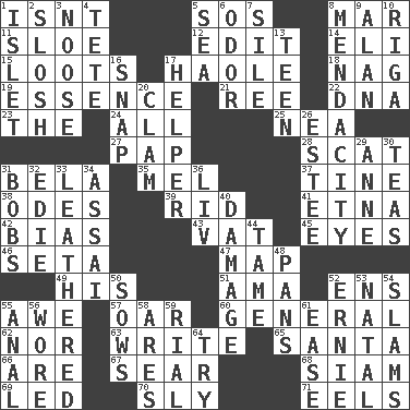 ACROSS 1. Is not 5. Distress signal 8. Spoil 11. _ gin 12. Prepare for publication 14. Connecticut Ivy Leaguer 15. Plunders 17. White Person, in Hawaii 18. Tired old horse 19. Gist 21. To separate or throw off 22. Heredity factor (abbr.) 23. Definite Article 24. Everything 25. Teachers' org. 27. Infant food 28. Jazz singing style 31. Actor Lugosi 35. Cartoonist voice _ Blanc 37. Prong on a fork 38. Lyric poems 39. To free from 41. Inactive volcano in Sicily 42. Prejudice 43. Large container 45. Sight organs 46. Bristle 47. Atlas unit 49. Part of HMS, perhaps 51. Nanny (var.) 52. Followers of ems 55. Deep reverence 57. Rowing implement 60. Commissioned military rank 62. Not either 63. Compose 65. Before Barbara or Clara 66. "We ___ not amused" (Victoria) 67. Burn superficially 68. Thailand, formerly 69. Directed 70. Wily 71. Snakelike fish DOWN 1. Small island 2. Agitate, as a liquid 3. Trap for birds or small mammals 4. Wig 5. Ocean 6. Aroma 7. Drop; flow; fall 8. Ananias' fault 9. ____ Jay Lerner 10. Capital of Latvia 13. Adolescent 16. Fastener 17. Aide 20. Burrowing marine mollusk 26. First name in cosmetics 29. Queen of England 1702-14 30. Beverages made from leaves 31. Moves up and down 32. Singer Brickell 33. Resembling or made to resemble leather 34. Slender Brazilian palm 36. 54 in ancient Rome 40. Break 44. Docile 48. Baking dishes 50. Sty mamas 52. Bert's buddy 53. Relating to or accompanying birth 54. Shuts with force 55. Of or related to the anus 56. Had on 58. Ancient Greek god of war 59. Monetary unit of Yemen 61. Relaxation 64. Attempt
