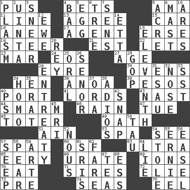 ACROSS 1. Purulenc 4. Stakes 8. Wet nurse (var.) 11. Actor's bit 13. Match 15. Auto 16. Afresh 17. Rep 18. Celtic language 19. Bull 21. Eastern Standard Time (abbr.) 22. Allows 23. Third mo. 24. Greek goddess of the dawn 27. Personal question 29. Jane of fiction 30. Baking chambers 34. Layer 36. Small Philippine buffalo 39. Mexican monetary units 40. Sweet dark-red dessert wine 41. Nobles 43. Political cartoonist Thomas 44. Excessive but superficial compliments 46. Water falling in drops from the sky 47. Third day of the wk. 48. Carrier 49. Pledge 51. The 18th letter of the Arabic alphabet 53. Health resort 54. Observe 57. Petty quarrel 60. Order of Saint Francis (abbr.) 63. Extremist 65. Suggestive of the supernatural 66. A salt of uric acid 69. Charged particles 70. Consume 71. Titles for men of rank and authority 72. Writer Wiesel 73. Before (prefix) 74. Oceans 75. Snakelike fish DOWN 1. Suffix with ecto or cyto 2. National forest in Provo, Utah 3. Scornful expression 4. Sound made by sheep 5. Oval reproductive body of a fowl 6. Relationship diagram 7. Elected reps. 8. 43,560 square feet 9. Vertical spar for supporting sails 10. Ancient Greek god of war 12. She-sheep 14. Singer James 18. Veterans Day date 20. Marina Del _, California 25. Of the mouth 26. Sir (Sp.) 28. Republican Party 29. Plea 31. Son of Isaac 32. Characteristic smell of wine 33. Fast jet (abbr.) 34. Same (prefix) 35. Part of Q.E.F. 37. Mouth or opening 38. Goodbye (Sp.) 40. Pacific Standard Time (abbr.) 42. Fastener 45. Medical imaging device (abbr.) 50. The 19th letter of the Greek alphabet 52. Common sense 54. Fur scarf 55. Bert's buddy 56. Artist's stand 57. Ooze 58. Lightbulb-shaped fruit 59. Johnson of "Laugh-In" 61. Indian titles of respect 62. Conductor's collection 64. Untruth 67. Beverage made from leaves 68. Curvy letter
