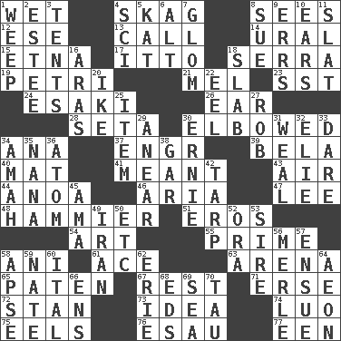 ACROSS 1. Dripping 4. Heroin 8. Observes 12. Compass dir. 13. Give a ring to 14. Mountain range 15. Inactive volcano in Sicily 17. "Tell ____ the Marines!" 18. Father Junipero _ 19. _ dish (used to culture cells) 21. Cartoonist voice _ Blanc 23. Fast jet (abbr.) 24. 1973 Nobel Price Winner (Physics) Leo 26. Hearing organ 28. Stalk of a moss capsule 30. Shoved, as through a crowd 34. Santa ___, CA 37. Engineer (abbr.) 39. Actor Lugosi 40. Floor protector 41. Intended 43. Wind 44. Small Philippine buffalo 46. Roberta Peters solo 47. Area sheltered from the wind 48. More overdramatic by comparison 51. Greek god of love 54. Tate display 55. A-one 58. Black tropical American cuckoo 61. Adept person 63. Sports stadium 65. Eucharist need 67. Relief 71. Celtic language 72. Comedian Laurel of Laurel & Hardy 73. The main thing one is thinking about 74. Nilotic language 75. Snakelike fish 76. Son of Isaac 77. Car or cant ending DOWN 1. Shed a tear 2. First name in cosmetics 3. Portable shelters 4. _-fi 5. Krazy ___ of comics 6. Keyboard modifier key 7. Seize upon or latch onto something 8. Institute legal proceedings 9. Blunders 10. Hearing organs 11. Narrow board 16. Caspian sea tributary 18. Thick slice 20. Mamie's husband 22. Snakelike fish 25. A distinct part 27. Director Reiner 29. Approach 30. Bert's buddy 31. Welt 32. Writer Wiesel 33. Have the gumption 34. Nursemaid 35. Nanny 36. Smallest unit of an element 38. Slender fish 42. Canvas cover 45. Nursemaid (var.) 49. SW Asia republic 50. And so on (abbr.) 52. Mouth or opening 53. Father 56. Haggard of country music 57. Follow as a consequence or result 58. Domed church section 59. Nathan's nickname 60. Slanted text style (abbr.) 62. 4th largest of the Great Lakes 64. Age 66. Followers of ems 68. Begley and Asner 69. Ocean 70. The 19th letter of the Greek alphabet