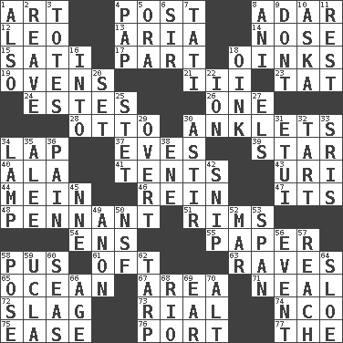 ACROSS 1. Nonscientific branch of learning 4. Mail 8. The sixth month of the Jewish calendar 12. Lion 13. Operatic vocal solo 14. Sense of smell 15. Suttee (variant) 17. Role in a play 18. Pig sounds 19. Baking chambers 21. One more than two 23. Make lace 24. _____ Park, CO 26. Single 28. Von Bismarck 30. Short socks 34. Infant locale 37. Nights before holidays 39. Play the lead 40. According to 41. Portable shelters 43. RI univ. 44. Count _ (2 wds.) 46. It's straight from the horse's mouth 47. It is 48. Pre-World Series prize 51. Basketball hoops 54. Followers of ems 55. Some stationery 58. Fluid product of inflammation 61. Often (poetically) 63. All-night dance parties 65. Sea 67. Length times width 71. Anneal 72. Volcanic refuse 73. Monetary unit of Yemen 74. Non-commissioned officer (abbr.) 75. Comfort 76. Sweet dark-red dessert wine 77. Definite Article DOWN 1. In addition 2. Break or tear apart 3. Lugs 4. Infant food 5. Mouth or opening 6. Title for a knight 7. Jacques of French films 8. Black tropical American cuckoo 9. Do not 10. "____ silly question..." 11. Take ten 16. To the inside or interior of 18. Pig sound 20. Arrange properly for use 22. Electrically charged atom 25. Proofreading order 27. Raised railways 29. Unconcealed 30. Moving about 31. Needle holder 32. Small pie 33. Indian titles of respect 34. Desk light 35. Toward shelter 36. Ache 38. Compass dir. 42. Clip 45. Compass dir. 49. Soon (poet.) 50. Science/research agcy. 52. Spoil 53. Connect, as a bridge 56. Happening 57. Arrive at 58. Airs 59. Southern CA. univ. 60. Oceans 62. Canvas cover 64. _ gin 66. Ripen 68. River (Sp.) 69. Ewer handle 70. The first octave above the treble staff
