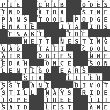 ACROSS 1. Sliced dessert 4. Baby bed with high sides 8. Lyric poems 12. Indiana (abbr.) 13. Opera by Verdi 14. Trig term 15. Zero-star reviews 17. Instrument 18. Porridge 19. Maternal 21. Call ___ day 23. Big collection agency 24. 1973 Nobel Price Winner (Physics) Leo 26. Binary compound 28. Remaining after all deductions 30. Snuggling 34. E Mali city 37. Jacques of French films 39. Calm and collected 40. Atmosphere 41. Off-Broadway awards 43. Compass dir. 44. Dutch treat 46. Single time 47. Manchild 48. Small, flat, pigmented spot on the skin 51. Hearing organs 54. R.R. building 55. 61 cubic inches 58. Fast jet (abbr.) 61. Black tropical American cuckoo 63. A piece of turf (Scot.) 65. Free of sound 67. Negative votes 71. Travel on or in a vehicle 72. Drink excessively 73. Woody plant 74. Teat (slang) 75. Expressed in words 76. For fear that 77. One (Scot) DOWN 1. Corncob 2. Lacking in sense or substance 3. Ferber et al. 4. Feline 5. River (Sp.) 6. Wedding promise 7. Indonesian resort city 8. Bear (Spanish) 9. "You Light Up My Life" star Conn 10. Engineer (abbr.) 11. Observes 16. Comedian Laurel of Laurel & Hardy 18. Groovy apts. 20. Make supply last 22. Neckwear 25. "Tell ____ the Marines!" 27. And so on (abbr.) 29. Off limits 30. Sibling's daughter 31. Charged atoms 32. Words to Nanette 33. Small, secluded valley 34. Highlander 35. Assistant 36. Northwest Algerian city 38. Metal container 42. Lick closed 45. Mountains (abbr.) 49. Slanted text style (abbr.) 50. Separate the seeds from cotton 52. To free from 53. Commotion 56. Webber/Rice musical 57. "The Thinker" sculptor 58. Fast planes 59. Portico 60. Native american tent (variation) 62. International (abbr.) 64. False hair 66. Directed 68. "We ___ not amused" (Victoria) 69. It is so 70. Arrange properly for use