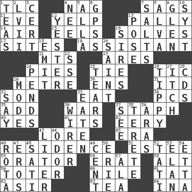 ACROSS 1. Affectionate concern, for short 4. Tired old horse 7. Sinks 11. First lady 12. Sharp bark 13. Friendly 14. Wind 15. Snakelike fish 16. Finds the solution 17. Settings 19. Aide 21. Mountains (abbr.) 23. Ancient Greek god of war 24. Sliced desserts 25. Make a knot 26. Nervous spasm 29. Distance measurement (Brit.) 30. Followers of ems 31. It would 32. Male offspring 33. Consume 34. Personal Computers (abbr.) 35. Find the sum of 36. Armed conflict 37. Staphylococcus 40. Consenting reply 41. ___ a Wonderful Life 42. Suggestive of the supernatural 43. Old wives' tales, e.g. 45. Period 46. Home 51. First name in cosmetics 55. Speaker 56. Part of Q.E.F. 58. The first octave above the treble staff 59. Carrier 60. "Death on the ____" 61. Make lace 62. SW Saudi Arabia district 63. Beverage made from leaves 64. _ tizzy (2 wds.) DOWN 1. Afternoon social gatherings 2. 57 in ancient Rome 3. Sure thing 4. Born 5. Silent film actress Nazimova 6. Global Positioning Systems (abbr.) 7. Table seasonings 8. Inventor's middle name 9. Small, secluded valley 10. System (abbr.) 12. Next before 13. Airs 16. Fathers 18. Send forth 20. Virtuous person 22. Compass dir. 24. Hangs 25. Pulls into pieces 26. Likely to tip or tilt 27. Hankering 28. Music discs 29. Method 32. Declare 33. Ingested 36. One who wires 37. Perceive with the eye 38. Cylindrical with tapered ends 39. Ancient river in northeast Turkey 43. 61 cubic inches 44. Scent 46. Round or rotation of duties 47. Greek god of love 48. Suttee (variant) 49. Penny 50. 4th largest of the Great Lakes 52. Jacques of French films 53. Flair 54. Singer James 57. According to