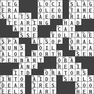 ACROSS 1. Part of a journey 4. Locales 8. Volcanic refuse 12. Period 13. Margarine 14. Docile 15. Table seasonings 18. Period of immesurable duration 19. Monetary unit of Yemen 20. Pulling into pieces 22. Possessed 23. Among 24. Domesticated feline 25. Compass dir. 26. Electrical Measurement 30. Health resort 33. Columnist Joseph or Stewart 36. Of the mouth 37. Religious women 39. Lubricate 40. California wine valley 41. _ vera 42. _ pole 44. Elected rep. 45. Pre-World Series prize 47. Chief or king in Benin or Nigeria 50. One (Scot) 51. Painter Guido (1575-1642) 53. It would 54. Speakers 57. To the inside or interior of 59. Assistant 61. Travel by water 63. Letter starter 64. Angers 65. "Barney Miller" actor Jack 66. Snakelike fish 67. Small pie 68. Layer DOWN 1. French article 2. Part of Q.E.F. 3. An organ shaped like a helmet 4. Grant temporary use of 5. Cassini of fashion 6. Corporate head (abbr.) 7. Electrically charged atom 8. Ski resort town in Vermont 9. Put down 10. Housemaid (var.) 11. Set 16. Scottish caps 17. Indian titles of respect 21. It may be bright or harebrained 22. Actor Linden 24. Police officer (slang) 26. Electrical Unit 27. Caspian sea tributary 28. Yawn 29. Enthusiasm 30. Fastener 31. Whimper 32. Soon (poet.) 34. Spoils 35. Title for a knight 38. Legislators 42. Compass dir. 43. Israeli folk dance 46. Added to 48. Antes 49. Small Philippine buffalo 52. From or relating to Ireland 53. Slanted text style (abbr.) 54. Baltic tributary 55. Respite 56. A type of plum 57. Binary compound 58. Born 59. Small island 60. Lyricist Gershwin 62. Male child