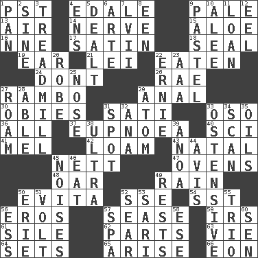 ACROSS 1. Pacific Standard Time (abbr.) 4. Peak District village in England 9. Light colored 13. Atmosphere 14. Boldness 15. _ vera 16. Compass dir. 17. Smooth fabric 18. Lick closed 19. Ewer handle 21. Luau accessory 22. Eroded 24. Do not 26. Actress Charlotte 27. Role for Stallone 29. Of or related to the anus 30. Off-Broadway awards 31. Suttee (variant) 33. Bear (Spanish) 36. Everything 37. Normal relaxed breathing 40. _-fi 41. Cartoonist voice _ Blanc 42. Rich soil 43. Relating to or accompanying birth 45. Remaining after all deductions 47. Baking chambers 48. Rowing implement 49. Precipitation 50. Webber/Rice musical 52. Compass dir. 54. Fast jet (abbr.) 56. Greek god of love 57. Gospel singer Marvin 59. Big collection agency 61. Filth; sediment 62. Actors' quests 63. Compete 64. Puts into a specified state 65. Ascend 66. A really long time DOWN 1. Baking dish 2. Trig term 3. Excercise machine 4. Followers of ems 5. Started a card game 6. Johnson of "Laugh-In" 7. 57 in ancient Rome 8. Car or cant ending 9. Soft color 10. Toward shelter 11. Grant temporary use of 12. Snakelike fish 20. Loose flowing garment 22. Bert's buddy 23. American Automobile Association (abbr.) 25. Olfactory organ 27. Wander aimlessly 28. Competent 29. Smallest unit of an element 31. Blemish 32. Santa ___, CA 33. Clearly or manifestly demonstrative 34. Examine minutely or intensely 35. Lubricates 38. Extreme 39. Small Philippine buffalo 44. Opinion 45. Annoying sounds 46. Consume 49. Musical pauses 50. 4th largest of the Great Lakes 51. Electrical Unit 52. Scorch 53. Indian skirt 55. Musical group of three 56. Curvy letter 57. Health resort 58. Compass dir. 60. Elected rep.