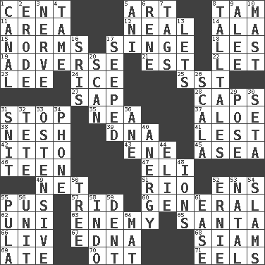 ACROSS 1. Penny 5. Tate display 8. Scottish cap 11. Length times width 12. Be tempered by heat 14. In the manner of 15. Typical models 17. Burn superficially 18. French article 19. Contrary to your interests or welfare 21. Eastern Standard Time (abbr.) 22. Allow 23. Area sheltered from the wind 24. Frozen water 25. Fast jet (abbr.) 27. Plant excrement 28. Balmoral and tarboosh 31. Cease 35. Teachers' org. 37. Medicinal plant 38. Delicate 39. Heredity factor (abbr.) 41. For fear that 42. "Tell ____ the Marines!" 43. Compass dir. 45. Toward the sea 46. Adolescent 47. Biblical high priest 49. Fish or hair follower 51. _ de Janeiro 52. Followers of ems 55. Festering 57. To free from 60. Commissioned military rank 62. Corn or form start 63. Foe 65. Before Barbara or Clara 66. 54 in ancient Rome 67. Pulitzer Prize-winning author Ferber 68. Thailand, formerly 69. Had dinner 70. Baseball player Mel 71. Snakelike fish DOWN 1. Lessep's creation 2. Wear away 3. Effrontery 4. Docile 5. Cuckoo 6. French philosopher Descartes 7. Labels 8. Baron Munchausen's specialties 9. Toward shelter 10. Vertical spar for supporting sails 13. Allows 16. Indian titles of respect 17. Oozed 20. Glance over 26. Any of the three canals of the cochlea 29. Airs 30. Stalk of a moss capsule 31. In a ____ (agitated or irritated) 32. Wig 33. Clearly or manifestly demonstrative 34. Give a jingle 36. One (Scot) 40. Disorder of the immune system 44. Writer Wiesel 48. Charged atoms 50. Family _ (genealogy) 52. Bert's buddy 53. Brizilian seaport 54. Shuts with force 55. Monetary unit of Botswana 56. A single undivided whole 58. _ china 59. Gouge 61. Comfort 64. Floor protector