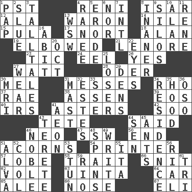 ACROSS 1. Pacific Standard Time (abbr.) 4. Painter Guido (1575-1642) 8. Austrian river, tributary to the Danube 12. Insect wing 13. Make _____ (do battle with) 14. "Death on the ____" 15. Monetary unit of Botswana 17. Derisive sound 18. ____ Jay Lerner 19. Shoved, as through a crowd 21. Poe poem 23. Nervous spasm 24. Snakelike fish 26. Affirmative reply 27. Electrical Unit 28. Baltic tributary 30. Cartoonist voice _ Blanc 31. Makes clutter 34. 17th letter of the Greek alphabet 37. Actress Charlotte 38. NE Netherlands city 39. Greek goddess of the dawn 40. Big collection agency 41. Michaelmas daisies 42. "Barney Miller" actor Jack 43. Wig 44. Expressed in words 46. Modern: prefix 47. Compass dir. 50. Conclude 51. Oak nuts 54. Hard copy producer 57. Ear part 58. Distinguishing feature 60. In a ____ (agitated or irritated) 62. Electrical Unit 63. National forest in Provo, Utah 64. Automobile 65. Toward shelter 66. Olfactory organ 67. Connecticut Ivy Leaguer DOWN 1. Infant food 2. Turn sharply 3. Baron Munchausen's specialties 4. The wife of a rajah (variant) 5. Wear away 6. And not 7. International (abbr.) 8. More lacking in sense or substance 9. Grain storage towers 10. Having or resembling wings 11. French philosopher Descartes 13. Compass dir. 16. "This won't hurt ____!" 20. Sep. follower 22. Snake ____ (dice throw) 25. Failure 27. Erode 29. Lairs 30. Medical imaging device (abbr.) 31. Vertical spar for supporting sails 32. _____ Park, CO 33. Compass dir. 34. Dwelling 35. Parka part 36. Bear (Spanish) 41. Age 43. Cylindrical with tapered ends 44. Elected rep. 45. Pismires 46. Having high moral qualities 48. Connects, as a bridge 49. Compose 51. Inventor's middle name 52. Calm and collected 53. Astound 55. Call ___ day 56. Monetary unit of Yemen 59. _ de Janeiro 61. Three (prefix)