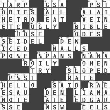 ACROSS 1. Canvas cover 5. Girls' org. (abbr.) 8. Pacific Standard Time (abbr.) 11. Off-Broadway awards 13. 100% 14. Jai _ 15. Paris' subway 16. Ingest 17. Distinctive style or manner 18. And so on (abbr.) 19. Unsightly 21. God's Word 22. Stockings 24. Lyric poems 25. Beer mug 27. Morning condensation 29. On the rocks 30. Promenades 32. Airs 33. Connects, as a bridge 35. Nanny 39. Turbulent 41. Presage 42. Attempt to accomplish something 43. Inclined 45. Inconspicuous attention getter 48. Pace 49. Phone greeting 50. Stated 52. Actress Charlotte 55. Son of Isaac 56. Lair 57. Climbing, woody, usually tropical vines 59. Short letter 60. Had dinner 61. _ Allan Poe 62. Compass dir. 63. Compass dir. 64. Snakelike fish DOWN 1. Heavy book 2. Collude with 3. Actors Guy, Robert Welles, and Clint 4. For each 5. Highlander 6. Kill 7. The first octave above the treble staff 8. Cadet 9. Travel by water 10. Prong on a fork 12. Lush 14. Enthusiastic 20. Set 21. Soup holder 23. More peculiar 25. Small drink 26. Environmental prefix 27. One of the 12 tribes of Israel 28. Raised railways 30. Can I? 31. Snout, nose 33. Title for a knight 34. Apply oneself diligently 36. Electrical Measurement 37. Born 38. Added to 40. Von Bismarck 43. Indian title of respect (Mr.) 44. Dipping utensil 45. Mexican monetary units 46. Chalkboard 47. Turn sharply 49. Coop moms 50. Arranges properly for use 51. Afresh 53. Of or related to the anus 54. Hearing organs 56. Fool 58. Binary compound