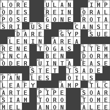 ACROSS 1. Old wives' tales, e.g. 5. ____ Bator 9. Naughty child 12. Lyric poems 13. It's straight from the horse's mouth 14. Of the mouth 15. Introduce or present, as a question 16. Went 17. Roll call or roster of names 18. Indian title of respect (Mr.) 19. Purpose 21. 2nd pers. sing. pres. of can (arch.) 22. Have the gumption 24. Flimflam 26. Institute legal proceedings 27. Soviet premier 1918-24 28. Type of rug 29. French philosopher Descartes 30. Ancient Roman robes 32. Detail 36. South American Indian 37. Benjamin's nick name 38. Dormintory (informal) 39. River in Europe 40. National forest in Provo, Utah 42. Relaxation 43. Proofreading order 44. Sadhe (variant) 46. Baking dish 49. French article 50. Lubricates 51. Like summer trees 53. Electrical Unit 54. Affectionate concern, for short 57. Johnson of "Laugh-In" 58. Corncob 61. Fly high 62. Thailand, formerly 63. "Corrida" creature 64. Heavy book 65. Cartoonist voice _ Blanc 66. At once, immediately (arch.) 67. Toward shelter DOWN 1. Chops off 2. Aroma 3. Dwelling 4. Compass dir. 5. Goad 6. Lion 7. The 18th letter of the Arabic alphabet 8. Compass dir. 9. Metal shackles 10. Taiwanese island in East China Sea 11. Food holder 14. Mouth or opening 19. RI univ. 20. Posted 21. Tax preparer (abbr.) 23. Approach 24. Let have 25. It is so 27. Grant temporary use of 28. Representative 29. _ de Janeiro 31. Off-Broadway awards 32. Perfect 33. Inedible or poisonous agaric 34. Celtic language 35. Madame (abbr.) 40. Shoshoni 41. Smallest unit of an element 43. Mischievous 45. Small drink 46. Suffix with ecto or cyto 47. Nest on high 48. Brizilian seaport 52. Opposite of masc. 53. A really long time 55. Unable to walk 56. Algonquian 58. Parent Teacher Association (abbr.) 59. Electrically charged atom 60. Adept person 61. R.R. building