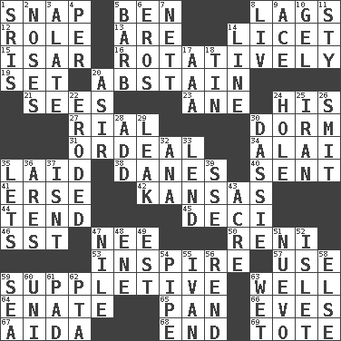 ACROSS 1. Fastener 5. Benjamin's nick name 8. Fails to keep up a pace 12. Hero or heavy, e.g. 13. "We ___ not amused" (Victoria) 14. It is permitted: Lat. 15. Austrian river, tributary to the Danube 16. Happening in regular succession 19. Arrange properly for use 20. Choose not to consume 21. Perceives with the eye 23. One (Scot) 24. Part of HMS, perhaps 27. Monetary unit of Yemen 30. Dormintory (informal) 31. Severe or trying experience 34. Jai ____ 35. Put down 38. Natives or inhabitants of Denmark 40. Transmitted 41. Celtic language 42. Sunflower state 44. Look after 45. Tenth: prefix 46. Fast jet (abbr.) 47. Born 50. Painter Guido (1575-1642) 53. Stimulate to action 57. Purpose 59. Supplementary 63. Water source 64. Maternal 65. Baking dish 66. Nights before holidays 67. Opera by Verdi 68. Conclude 69. Lug DOWN 1. Indian titles of respect 2. Olfactory organs 3. Having winglike extensions 4. For each 5. Sharp remark 6. Greek god of love 7. Remaining after all deductions 8. 54 in ancient Rome 9. Adept person 10. Set 11. Filthy place 14. Actor's bit 17. Auto club (abbr.) 18. Shallow baking pan 20. SW Saudi Arabia district 22. Worn away 24. Hollow 25. SW Asia republic 26. Stricken, poetically 28. Say or write further 29. Path through which fluid escapes 30. Hyrax 32. Santa ___, CA 33. Grant temporary use of 35. Allows 36. Ancient Greek god of war 37. Is not 39. Compass dir. 43. Land measure 47. Mediterranean tributary 48. Compass dir. 49. Eastern Standard Time (abbr.) 51. New (sp.) 52. Small island 54. Corncob 55. _ the terrible 56. Tear apart 58. Otherwise 59. Ocean 60. Single; one (prefix) 61. Writing tablet 62. Parent Teacher Assoc. 63. Soggy