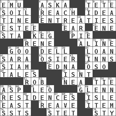 ACROSS 1. Australian flightless bird 4. "____ silly question..." 8. False hair 12. Land 14. Arrive at 16. The main thing one is thinking about 17. Prong on a fork 18. Pleas 20. First name in cosmetics 22. Ewer handle 23. Compass dir. 24. R.R. building 25. Barrel 28. Sliced dessert 30. French philosopher Descartes 31. Place in a line 35. Thick or sticky substance 37. Small valley 40. Grant temporary use of 41. "Two Mules for Sister ____" 42. Flexible twig of a willow tree 44. Lodging establishments 45. Thailand, formerly 46. Pulitzer Prize-winning author Ferber 47. Bear (Spanish) 48. Falsehoods 50. Is not 52. Director Reiner 54. Teachers' org. 55. Standoff 58. Cleo's killer 61. Lion 63. American astronaut and politician John 65. Dwellings 70. Small island 71. 90 degrees 72. Rob, plunder, or pillage 73. Detail 74. Fast planes 75. Proofreading order 76. Filthy place DOWN 1. _____ Park, CO 2. Damp 3. National forest in Provo, Utah 4. "We ___ not amused" (Victoria) 5. Elected rep. 6. Krazy ___ of comics 7. Measure of real estate 8. Teat (slang) 9. Singer Brickell 10. Adolescent 11. Comfort 13. Area sheltered from the wind 15. Pile 19. Roberta Peters solo 21. Supplement with great effort 26. Inside; within (prefix) 27. Honkers 29. American author Paul (1891-1958) 30. Wanderer 32. Charged atoms 33. Billionth: prefix 34. Followers of ems 35. Greek goddess of the earth (variant) 36. Taken by mouth 38. Hat (slang) 39. Soviet premier 1918-24 41. Fast jet (abbr.) 43. To erase 49. Exchanged or delivered for money 51. Tired old horse 53. Fermented drink made from hops 55. Trials 56. An arm off of a larger body of water 57. Foe 58. Ancient Greek god of war 59. Oceans 60. Inconspicuous attention getter 62. Washington bills 64. Cards in a Roman deck? 66. ___ a Wonderful Life 67. Feline 68. Night before a holiday 69. Put into a specified state