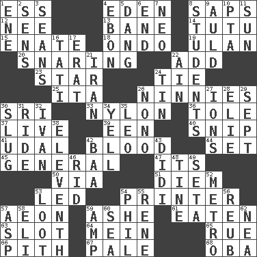 ACROSS 1. Curvy letter 4. Paradise 8. Plant excrements 12. Born 13. Object of repulsion 14. Ballerina skirt 15. Related on the mother's side 18. Southwest Nigerian state 19. ____ Bator, Mongolia 20. Catching in a trap 22. Say or write further 23. Play the lead 24. Standoff 25. Call ___ day 26. Simpletons 30. Indian title of respect (Mr.) 33. High-strength synthetic material 36. Lacquered or enameled metalware 37. Moving, as bait 39. Car or cant ending 40. Clip 41. Freehold land 42. Vital fluid 44. Arrange properly for use 45. Commissioned military rank 47. ___ a Wonderful Life 50. By way of 51. South Vietnam president (1954) 53. Directed 54. Hard copy producer 57. Age 59. American tennis player Robert 61. Ingested 63. Narrow, elongated depression 64. Count _ (2 wds.) 65. Regret 66. Essential or central part 67. Diluted with white 68. Chief or king in Benin or Nigeria DOWN 1. Compass dir. 2. Elected reps. 3. Seines 4. Inky black, to poets 5. Mild oath, euphamism for damn 6. Conclude 7. Modern: prefix 8. SAT takers 9. Old (Scot.) 10. Parent Teacher Assoc. 11. Player for Phoenix 16. Jacques of French films 17. Part of Q.E.F. 21. SW Asia republic 22. The 18th letter of the Arabic alphabet 24. Shallow baking pan 26. Words to Nanette 27. Charged atoms 28. Writer Wiesel 29. Back-to-school mo. 30. Strike heavily 31. Travel on an animal 32. _ the terrible 34. Shout 35. Lion 38. Veterans Day date 42. Sound made by sheep 43. "You Light Up My Life" star Conn 46. To free from 48. Prong on a fork 49. Bristle 52. Paris' subway 53. Plunder 54. Silvers or Donahue 55. French philosopher Descartes 56. Reuben's nickname 57. Cleo's killer 58. Connecticut Ivy Leaguer 59. Electrical Unit 60. Ocean 62. Teachers' org.