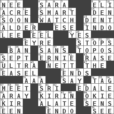 ACROSS 1. Born 4. "Two Mules for Sister ____" 8. Biblical high priest 11. 1/640 square mile 13. Don Adams' spy role 15. Lair 16. Within a short period 17. Timepiece 18. Gouge 19. Tree or shrub in the Birch family 21. Compass dir. 22. _ china 23. Area sheltered from the wind 24. Snakelike fish 27. Affirmative reply 29. Jane of fiction 30. Obstructs or blocks passage 34. Prohibit 36. Without 39. Literary convention 40. Back-to-school mo. 41. Bert's buddy 43. Raze (variant) 44. Extreme 46. Remaining after all deductions 47. Definite Article 48. Artist's stand 49. Extremities 51. American Automobile Association (abbr.) 53. Declare 54. Label 57. Rendezvous 60. Indian title of respect (Mr.) 63. Peak District village in England 65. Like ___ of sunshine 66. Japanese brewing company 69. Migrant worker of the '30s 70. Apertif with cassis 71. Having winglike extensions 72. Elected reps. 73. Car or cant ending 74. Inside; within (prefix) 75. Observe DOWN 1. Rhinal 2. Learning spot: Fr. 3. Eat (away) 4. Compass dir. 5. Nanny (var.) 6. Assign a rank or rating to 7. Arches 8. Genesis locale 9. Grant temporary use of 10. To the inside or interior of 12. Compass dir. 14. Those people 18. What propaganda does 20. Marina Del _, California 25. Celtic language 26. Acquire or gain knowledge or skills 28. Eastern Standard Time (abbr.) 29. Plea 31. Brightly colored fish 32. Airs 33. Compass dir. 34. Actor Lugosi 35. Flats, for short 37. Compass dir. 38. Locates 40. Take to court 42. Inactive volcano in Sicily 45. In the manner of 50. Color 52. "____ silly question..." 54. Proceeds 55. Place in a line 56. Honkers 57. Cause to be 58. 4th largest of the Great Lakes 59. Merit 61. Cause heat under the collar 62. SW Asia republic 64. Two (Sp.) 67. It would 68. Modern: prefix
