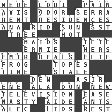 ACROSS 1. Ancient Persian 5. Farming town in central California 9. Ache 13. Deliberation 14. Aroma 15. Spanish missionary in California 16. Monthly bill 17. Homes 19. Santa ___, CA 20. To free from 21. Player for Phoenix 22. Fast jet (abbr.) 23. Relationship diagram 25. Being at a high temperature 26. Women servants 30. False hair 34. Bert's buddy 35. Possessive pronoun 36. Independent ruler or chieftain 39. Allots cards 42. Writer Wiesel 43. Tree-dwelling hopper 44. Drinks excessively 46. Prong on a fork 47. Showing deterioration from age 48. Lair 51. SW Saudi Arabia district 54. Compass dir. 57. In the manner of 58. Spanish title 60. ___ Haven, CT 62. Boob tube 65. Comfort 66. Smutty 67. Helper 68. Pismires 69. Actor Baldwin 70. Hats (slang) 71. Respite DOWN 1. Hindu Mythology: god of death 2. Happening 3. Middle Eastern gold or silver currency 4. Eastern Standard Time (abbr.) 5. Australian parrot (variant) 6. Wrote a lyric poem 7. Two (Sp.) 8. From or relating to Ireland 9. Writing instrument 10. Arches 11. Angers 12. Political cartoonist Thomas 15. Transmitted 18. Superhero pair 20. Tail end 24. Develop 27. Indiana (abbr.) 28. Pass on 29. Theater features 30. College papers 31. Snakelike fish 32. Three (prefix) 33. Compass dir. 36. Bank Draft (abbr.) 37. Medical imaging device (abbr.) 38. Electrically charged atom 40. Car dealer's back yard 41. Health resort 45. Flair 48. American folk hero Crockett 49. Connecticut Ivy Leaguer 50. Relating to the nose 52. Silly 53. Musical pauses 54. Inactive volcano in Sicily 55. Actress Patricia 56. Otherwise 58. Texas town _ City 59. Washington bills 61. 270 degrees 63. And so on (abbr.) 64. One more than two 65. Hearing organ