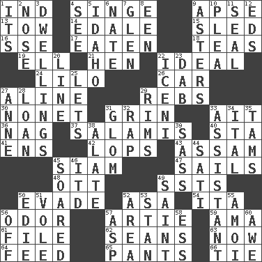 ACROSS 1. Working for oneself (abbr.) 4. Scorch 9. Domed church section 13. Pull behind 14. Peak District village in England 15. Downhill vehicle 16. Compass dir. 17. Ingested 18. Beverages made from leaves 19. Pipe bend 21. Layer 22. Perfect 24. _ and Stitch 26. Automobile 27. Place in a line 29. Confederate soldiers (slang) 30. Music written for nine 31. Smile widely 33. Small island 36. Tired old horse 37. Deli grouping 40. R.R. building 41. Followers of ems 42. Chops off 43. Indian state 45. Thailand, formerly 47. Travel by water 48. Baseball player Mel 49. Fast planes 50. Elude 52. White ___ sheet 54. Call ___ day 56. Scent 57. Nick name for Arthur 59. Wet nurse (var.) 61. Do some clerical work 62. Seines 63. Immediately 64. Nourish 65. Leg coverings 66. Neckwear DOWN 1. It is 2. Characteristic smell of wine 3. Homes 4. Observe 5. Potato state 6. Nathan's nickname 7. Small, secluded valley 8. Car or cant ending 9. Michaelmas daisies 10. Entreaty 11. Lick closed 12. Begley and Asner 20. Actor's bit 22. Ancient Celtic tribe of eastern Britain 23. Small moist lump or mass 25. Allows 27. Singer Murray 28. Grant temporary use of 29. Basketball hoops 31. Seize upon or latch onto something 32. Strike 33. Aide 34. Slanted text style (abbr.) 35. Scottish caps 38. Having winglike extensions 39. Backtalk 44. Suttee (variant) 45. Flew 46. It would 49. Virtuous person 50. Singer Brickell 51. Grand slam 52. Length times width 53. Comedian Laurel of Laurel & Hardy 55. Mine, in Marseilles 56. Not in operation 57. Cleo's killer 58. Double-curved letter 60. Deep reverence