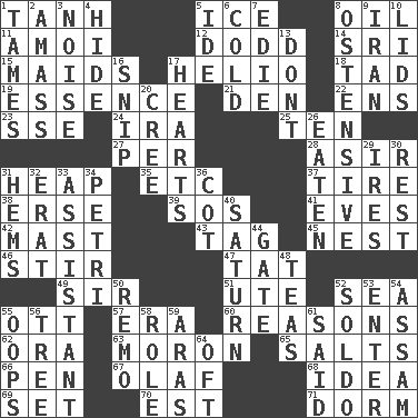 ACROSS 1. Hyperbolic tangent 5. Frozen water 8. Lubricate 11. Mine, in Marseilles 12. Texas town _ City 14. _ Lanka 15. Women servants 17. Sun: prefix 18. Small amount or degree 19. Gist 21. Lair 22. Followers of ems 23. Compass dir. 24. Retirement account (abbr.) 25. Nine, plus one 27. For each 28. SW Saudi Arabia district 31. Pile 35. And so on (abbr.) 37. Hoop that covers a wheel 38. Celtic language 39. Distress signal 41. Nights before holidays 42. Vertical spar for supporting sails 43. Label 45. Egg locale 46. Move through with a circular motion 47. Make lace 49. Title for a knight 51. Shoshoni 52. Ocean 55. Baseball player Mel 57. Period 60. Thinks logically 62. Mouth or opening 63. Person of subnormal intelligence 65. Table seasonings 66. Writing instrument 67. Norwegian king 68. It may be bright or harebrained 69. Put into a specified state 70. Eastern Standard Time (abbr.) 71. Dormintory (informal) DOWN 1. Makes less strong or intense 2. Collect or gather 3. Annoying sound 4. Flintstone garb 5. Binary compound 6. Chilled 7. Singer Brickell 8. Clearly or manifestly demonstrative 9. SW Asia republic 10. Hats (slang) 13. Do not 16. Sever or remove by pinching or nipping 17. Centers 20. Algonquian 26. Ingested 29. Angers 30. Take ten 31. Cloth borders 32. Part of Q.E.F. 33. Aide 34. _ dish (used to culture cells) 36. Small bed 40. Titan orbits this 44. Yard entry 48. Beverages made from leaves 50. San ____ (Riviera town) 52. Twentieth part of a lira 53. Keyboard key 54. Indian state 55. I made a mistake 56. Woody plant 58. Hero or heavy, e.g. 59. Caspian sea tributary 61. Stated 64. Often (poetically)