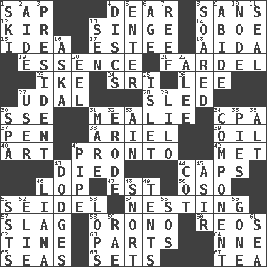 ACROSS 1. Plant excrement 4. Letter starter 8. Without 12. Apertif with cassis 13. Burn superficially 14. Mitch Miller's instrument 15. The content of cognition 17. First name in cosmetics 18. Opera by Verdi 19. Core 21. Bundle 23. Mamie's husband 24. _ Lanka 26. Area sheltered from the wind 27. Freehold land 28. Downhill vehicle 30. Compass dir. 31. Ear of corn 34. Numbers guy (abbr.) 37. Fenced enclosure 38. Satellite of Uranus 39. Petroleum 40. Nonscientific branch of learning 41. Right away 42. Was introduced to 43. Passed on 44. Smile enhancers 46. Chop off 47. Eastern Standard Time (abbr.) 50. Bear (Spanish) 51. Beer mug 54. Nestling 57. Volcanic refuse 58. U. of Maine site 60. Vintage cars 62. Prong on a fork 63. Components 64. Compass dir. 65. Oceans 66. Arranges properly for use 67. Afternoon social gathering DOWN 1. What Jean-Claude Killy likes to do 2. Assistant 3. Elected leader of a country 4. Flat circles 5. Keyboard key 6. Personal question 7. Coral collection 8. Flew 9. Tolerate 10. Connecting point 11. Lick closed 13. Elected rep. 16. "____ silly question..." 20. Snakelike fish 22. Toward shelter 25. Small island 27. One who makes use of a thing 29. _ and Stitch 30. Health resort 31. Female horse 32. Wear away 33. The 18th letter of the Arabic alphabet 34. Part 35. Sliced desserts 36. Keyboard modifier key 41. Corncob 43. Evades 44. Small bed 45. SW Saudi Arabia district 46. Woody, climbing, usually tropical plant 48. Derisive sound 49. Portable shelters 51. Fast planes 52. Writer Wiesel 53. Chops off 55. Mayday 56. Went 59. Actress Charlotte 61. Ocean