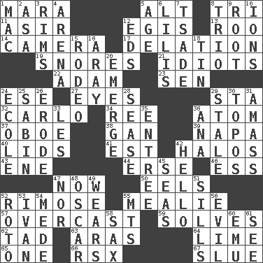 ACROSS 1. Hindu Mythology: god of death 5. Keyboard modifier key 8. Three (prefix) 11. SW Saudi Arabia district 12. The front part of a cuirass 13. Friend of Pooh 14. Device for capturing images 17. Conveyance 19. Sounds asleep 21. Foolish or stupid persons 22. First of billions? 23. Elected rep. 24. Compass dir. 27. Snake ____ (dice throw) 29. R.R. building 32. Monte _, Las Vegas Hotel/Casino 34. To separate or throw off 36. Tiny particle 37. Mitch Miller's instrument 38. Separate the seeds from cotton 39. California wine valley 40. Flaplike coverings 41. Eastern Standard Time (abbr.) 42. Rings 43. Compass dir. 44. Celtic language 46. Curvy letter 47. At this time 50. Snakelike fish 52. Full of chinks, cracks, or crevices 55. Ear of corn 57. Cloudy 59. Finds the solution 62. Small amount or degree 63. Caspian sea tributary 64. Welles in "The Third Man" 65. Single 66. Acura sports coupe 67. Change direction abruptly DOWN 1. Big _ 2. White ___ sheet 3. Basketball hoops 4. Sports stadium 5. Ripen 6. Ms. Damita and namesakes 7. Sadhe (variant) 8. Musical group of three 9. Carrot, for example 10. Charged particles 12. Begley and Asner 15. Cowboy competition 16. Like ___ of sunshine 18. Shallow baking pan 20. Develop 24. Learning spot: Fr. 25. Unit of acoustic absorption 26. Wear away 28. Gospel singer Marvin 29. Showing deterioration from age 30. Traditional theme or motif 31. Collect or gather 33. French article 35. Main course 36. Santa ___, CA 42. Phone greeting 45. Oceans 47. Or not 48. Motion picture award 49. Erodes 51. Beverly of Met fame 52. Printing process, for short 53. "Terrible" tsar 54. Ancient Persian 55. Mountains (abbr.) 56. Morally bad or wrong 58. Saxophone 60. Australian flightless bird 61. Observe