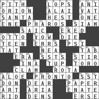 ACROSS 1. Essential or central part 5. Chops off 9. Black tropical American cuckoo 12. Greek mythologigal hunter 14. Jai ____ 15. Large container 16. Before Barbara or Clara 17. Behest 18. Single 19. Compass dir. 20. N Egypt peninsula 23. Thailand, formerly 24. Ketch in the Levant 25. Made supply last 27. Von Bismarck 30. Solemn pledge 32. Expire 33. Adolescent 34. Blunders 36. Air pressure measure (abbr.) 38. Make lace 39. Teachers' org. 40. Keyboard key 43. Epoch 46. Fast planes 48. Tumult 49. _ tizzy (2 wds.) 51. Uncastrated adult male sheep 52. "Corrida" creature 53. Burrowing marine mollusk 54. Roll call or roster of names 56. _ vera 58. Right away 61. Fast jet (abbr.) 64. Spanish title 65. Letter starter 66. Some stationery 68. Nonscientific branch of learning 69. Roberta Peters solo 70. Related on the mother's side 71. To free from 72. Hiding places for outlaws 73. Celtic language DOWN 1. Introduce or present, as a question 2. SW Asia republic 3. Prong on a fork 4. Being at a high temperature 5. Cowardly lion portrayer 6. Butter sub 7. Went by 8. Be seated 9. Stay clear from 10. Grandmother 11. A whole individual unit 13. California wine valley 21. Hub of activity 22. Oak nuts 23. Observes 24. Male offspring 26. Sleep 27. Baseball player Mel 28. Beverage made from leaves 29. Wig 31. Obtain by seizing forcibly or violently 35. Titan orbits this 37. "Tell ____ the Marines!" 41. Atmosphere 42. Sis' sibling 44. Cause heat under the collar 45. Santa ___, CA 47. Blemish 48. R.R. building 50. Electrical Unit 53. Continued (abbr.) 55. Drink excessively 56. The sixth month of the Jewish calendar 57. Australian parrot (variant) 59. Precipitation 60. Mouths or openings 61. Practice fight 62. Puts into a specified state 63. Family _ (genealogy) 65. June honoree 67. One (Scot)