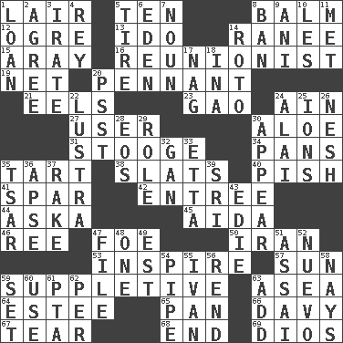 ACROSS 1. Den 5. "___ Little Indians" 8. Lip ointment 12. Legendary monster 13. Wedding promise 14. Indian princess (variant) 15. Like ___ of sunshine 16. One who advocates reunion 19. Fish or hair follower 20. Pre-World Series prize 21. Snakelike fish 23. E Mali city 24. The 18th letter of the Arabic alphabet 27. One who makes use of a thing 30. Medicinal plant 31. Moe Howard, for one 34. Baking dishes 35. Small pie 38. Narrow boards 40. Expression of disdain 41. Coast Guard woman 42. Main course 44. "____ silly question..." 45. Opera by Verdi 46. To separate or throw off 47. Enemy 50. SW Asia republic 53. Stimulate to action 57. Player for Phoenix 59. Supplementary 63. At sea 64. First name in cosmetics 65. Baking dish 66. American folk hero Crockett 67. Rend 68. Conclusion 69. "Vaya con ____" DOWN 1. Grant temporary use of 2. Match 3. Feeling or showing extreme anger 4. Marina Del _, California 5. Hoop that covers a wheel 6. Genesis locale 7. Part of speech 8. Forbid 9. Black tropical American cuckoo 10. French article 11. Was introduced to 14. Printing process, for short 17. Tired old horse 18. _ tizzy (2 wds.) 20. Inconspicuous attention getter 22. A period of five years 24. Jai ____ 25. Charged particles 26. Tender 28. Greek goddess of the dawn 29. Hero or heavy, e.g. 30. Seem 32. Separate the seeds from cotton 33. Singer James 35. Russian ruler of old 36. Domed church section 37. Immoral or dissolute person 39. Indian title of respect (Mr.) 43. Singer Brickell 47. Do some clerical work 48. Single 49. Eastern Standard Time (abbr.) 51. Slender Brazilian palm 52. New (sp.) 54. Corncob 55. "Terrible" tsar 56. Tear apart 58. Negative votes 59. Put into a specified state 60. Purpose 61. Parent Teacher Association (abbr.) 62. For each 63. Increase