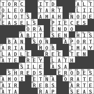ACROSS 1. Torque (variant) 5. It would 8. The first octave above the treble staff 11. Butter sub 12. Small pie 14. Cards in a Roman deck? 15. Ground plans 17. Nursemaid 18. Thickened enlargement 19. Artist's stands 21. Parts 23. Mouth or opening 25. Inside; within (prefix) 26. "This won't hurt ____!" 27. Elected rep. 28. Part of HMS, perhaps 31. Forbid 33. Male child 35. To the left, to Queeg 37. Operatic vocal solo 38. Crowd into 40. "If ____ say so..." 41. Dipping utensil 43. To riddle 45. "___ Little Indians" 46. Had dinner 47. Marina Del _, California 50. Thin strip of wood or metal 52. Drop; flow; fall 53. White ___ sheet 54. Fragments 56. Eats (away) 61. Mine, in Marseilles 62. Inactive volcano in Sicily 65. Declaim 66. Wind 67. Confederate soldiers (slang) 68. Johnson of "Laugh-In" 69. _ moment's notice (2 wds.) 70. Reproach for some lapse or misdeed 71. Oceans DOWN 1. Drink excessively 2. Water jar 3. Vintage cars 4. ____ d'Azur (French Riviera) 5. Call ___ day 6. Scottish cap 7. Window treatments 8. Medicinal plant 9. Hats (slang) 10. Make a knot 13. One or ones belonging to thee 16. Messy guy 18. Non-commissioned officer (abbr.) 20. Indian titles of respect 22. Pulitzer Prize-winning author Ferber 24. Tiny particle 26. Of or related to the anus 28. Dwelling 29. SW Asia republic 30. Filthy place 31. Naughty child 32. Helper 34. Not either 36. Heart or essence 37. Chicken ___ king 39. Actor Lugosi 42. 4th largest of the Great Lakes 44. Relaxation 48. A person who is older than you are 49. Last 51. Edible starchy tuberous root 52. Indian title of respect (Mr.) 54. Stricken, poetically 55. Israeli folk dance 57. Mouths or openings 58. Have the gumption 59. Singer James 60. Perceives with the eye 61. American Automobile Association (abbr.) 63. Basketball assoc. 64. Cleo's killer