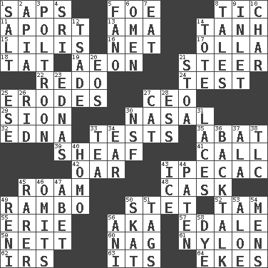 ACROSS 1. Plant excrements 5. Enemy 8. Nervous spasm 11. To the left, to Queeg 13. Nursemaid (var.) 14. Hyperbolic tangent 15. Ms. Damita and namesakes 16. Fish or hair follower 17. Spanish pot 18. Make lace 19. Age 21. Guide 22. Do over again 24. Trial 25. Eats (away) 27. Corporate head (abbr.) 29. The Jewish people; Israel 30. Rhinal 32. Pulitzer Prize-winning author Ferber 33. Trials 35. Blind as ____ 39. Bundle of cut stalks of grain 41. Give a ring to 42. Rowing implement 43. Medicinal drug used to evoke vomiting 45. Wander 48. Keg 49. Role for Stallone 50. Proofreading order 52. Scottish cap 55. One of the Great Lakes 56. Alias (abbr.) 57. Peak District village in England 59. Remaining after all deductions 60. Tired old horse 61. High-strength synthetic material 62. Big collection agency 63. ___ a Wonderful Life 64. Makes supply last DOWN 1. Table seasoning 2. Capital of Western Samoa 3. Characterized by complete cowardliness 4. _ Lanka 5. Papal veil 6. Sign of something about to happen 7. Ingest 8. Stories 9. An arm off of a larger body of water 10. Burn to charcoal 12. Sadhe (variant) 14. Carry 20. Greek goddess of the dawn 21. Portico 23. Ferber et al. 25. Compass dir. 26. To free from 27. Feline 28. Curvy letter 30. Science/research agcy. 31. Shoestrings 33. Afternoon social gathering 34. Hearing organ 36. Sass 37. In the manner of 38. Affectionate concern, for short 40. Same (prefix) 43. Frozen water 44. Eucharist need 45. More uncommon 46. Leaves out 47. Collude with 49. Painter Guido (1575-1642) 50. Three-handed card game 51. Labels 53. _ vera 54. Not women's 56. Black tropical American cuckoo 58. Color