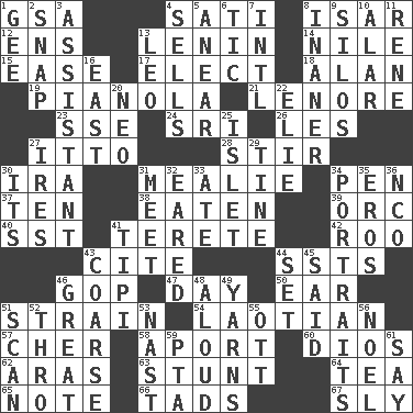ACROSS 1. Girls' org. (abbr.) 4. Suttee (variant) 8. Austrian river, tributary to the Danube 12. Followers of ems 13. Soviet premier 1918-24 14. "Death on the ____" 15. Comfort 17. Voters do this 18. Actor Alda or Thicke 19. Player piano 21. Poe poem 23. Compass dir. 24. _ Lanka 26. French article 27. "Tell ____ the Marines!" 28. Disorderly outburst 30. Lyricist Gershwin 31. Ear of corn 34. Fenced enclosure 37. Nine, plus one 38. Consumed 39. The grampus (Milton) 40. Fast jet (abbr.) 41. Cigar-shaped 42. Friend of Pooh 43. Quote 44. Fast planes 46. Grand Old Party 47. 24 hours 50. Hearing organ 51. Put through a sieve 54. Of or relating to Laos or its people 57. "Mermaids" star 58. To the left, to Queeg 60. "Vaya con ____" 62. Ancient river in northeast Turkey 63. Difficult or unusual or dangerous feat 64. Afternoon social gathering 65. Brief written record 66. Bits 67. Stealthy DOWN 1. Turn to the right 2. Fastener 3. Aide 4. Makes a sale 5. Approach 6. Nervous spasm 7. International (abbr.) 8. Sillier 9. Grain storage towers 10. Having or resembling wings 11. French philosopher Descartes 13. Lion 16. 90 degrees 20. Modern: prefix 22. Writer Wiesel 25. Small island 27. Angers 29. Prong on a fork 30. It is 31. Rendezvous 32. Having ears or earlike features 33. Had dinner 34. Likenesses of persons 35. Greek god of love 36. Non-commissioned officer (abbr.) 41. Native american tent (variation) 43. Rough 44. Put into a specified state 45. Expressed in words 46. Relatively large 48. Verbally 49. Tall tales 51. Glance over 52. Through, poetically 53. Political cartoonist Thomas 55. Baseball player Mel 56. Christmas carol 59. Parent Teacher Association (abbr.) 61. Declare